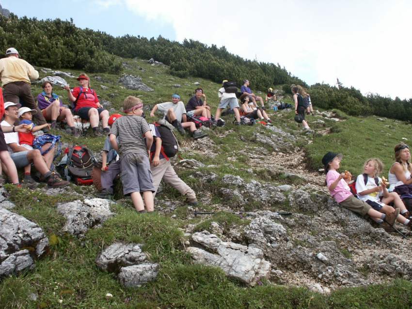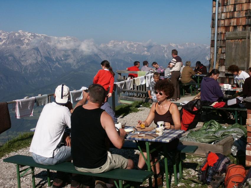 Bei diesmal guten Wetteraussichten fuhren wir zur Werfener Hütte ins Tennengebirge. Von Werfenweng / Wengerau über die Ellmaualm zur Werfener Hütte, das ist nichts für Warmduscher sondern schon eine richtig knackige Bergtour. Aber mit gut einge-teilten Kräften und Pausen schafften wir alle den Aufstieg mehr oder weniger ganz locker. Leider waren die beiden versprochen Lamas des Hüttenwirtes verletzt im Tal, was die Kinder schon etwas traurig stimmte. Auf der urigen Hütte angekommen, erholten sich die Eltern bei Kaffee und Kuchen und der herrlichen Aussicht auf der Terrasse und die Kinder nahmen gleich die Lager in Beschlag. Bestens versorgt durch die Hüttenwirtin und den Hüttenwirt ging’s nach dem Abendessen zum gemütlichen Hüttenabend über.