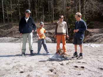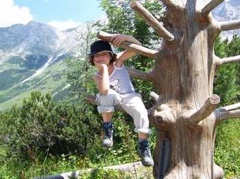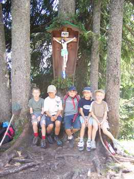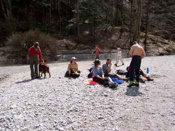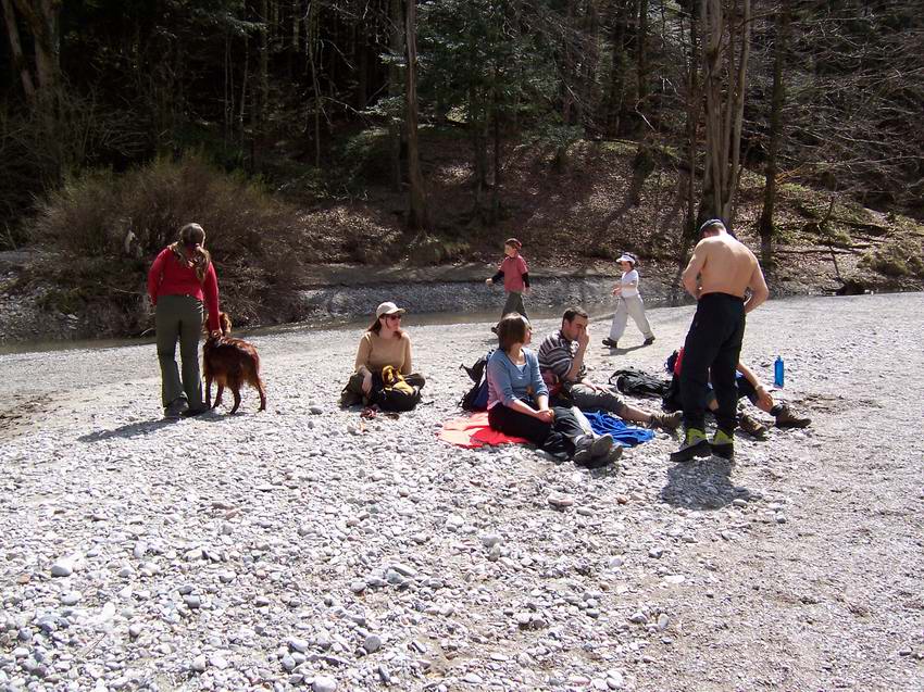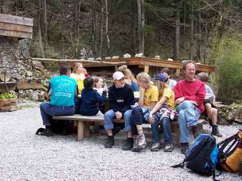 Bei bestem Wetter trafen sich 10 Familien um den Schmugglerweg zu beschreiten. Unsere „Schmuggelware“ beschränkte sich lediglich auf die im Rucksack befindliche Brotzeit. Entlang der Tiroler Ache ging es bis Maria Klobenstein, wo die Kinder schon ganz neugierig auf die dortige Hängebrücke über die Tiroler Ache waren. Eine der vielen Sandbänke nutzten nur die Eltern für eine ausgiebige Sonnenpause. Nachdem die Kinder Holz gesammelt hatten, wurde sogar ein Lagerfeuer gemacht. Andere wieder waren als Baumeister beim Bauen von Staudämmen beschäftigt. Die Mütter und auch Väter nutzten die Zeit für eine Kaffeepause im gemütlichen Wirtsgarten. Besser konnte der Auftakt für das Familienprogramm nicht beginnen.