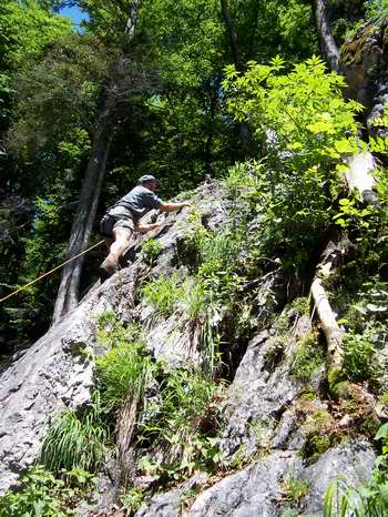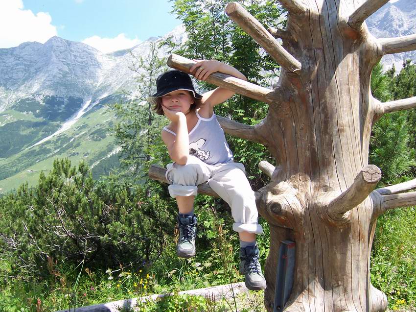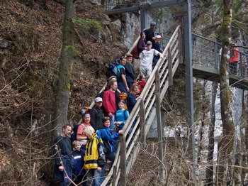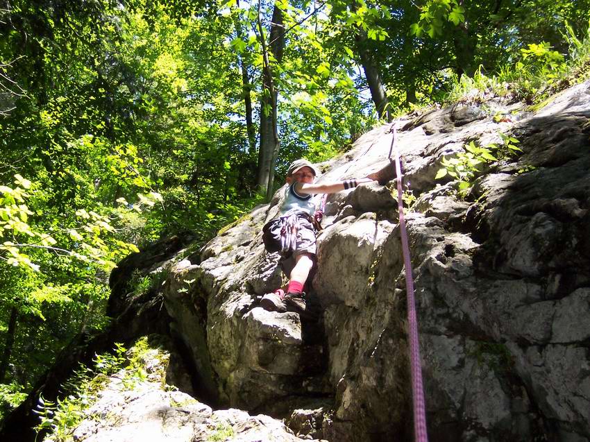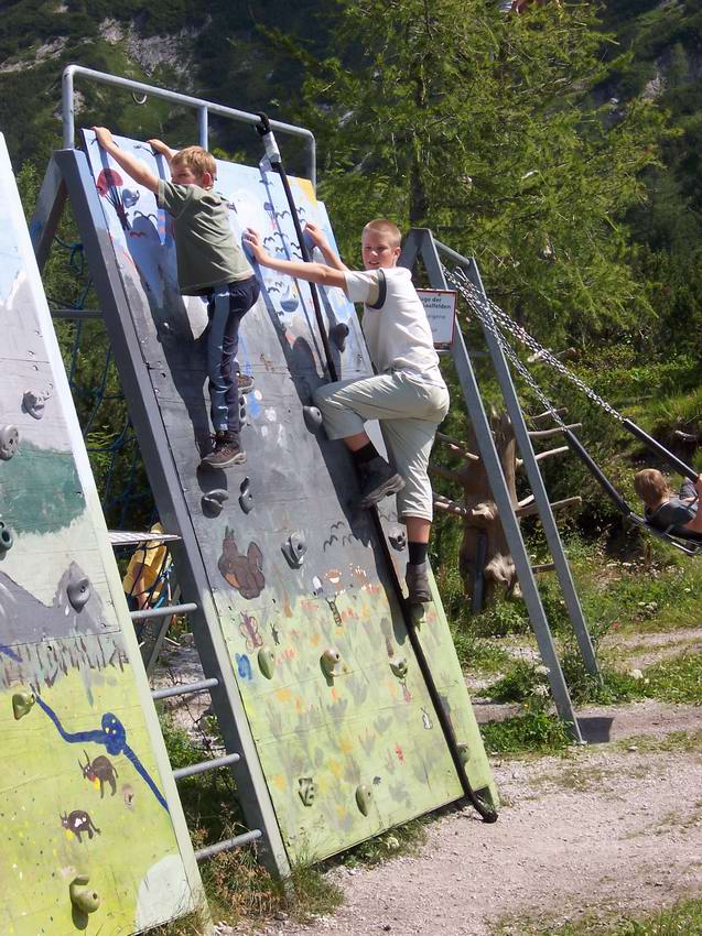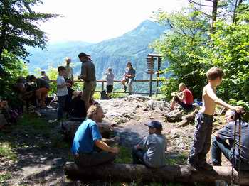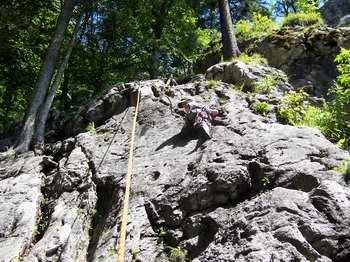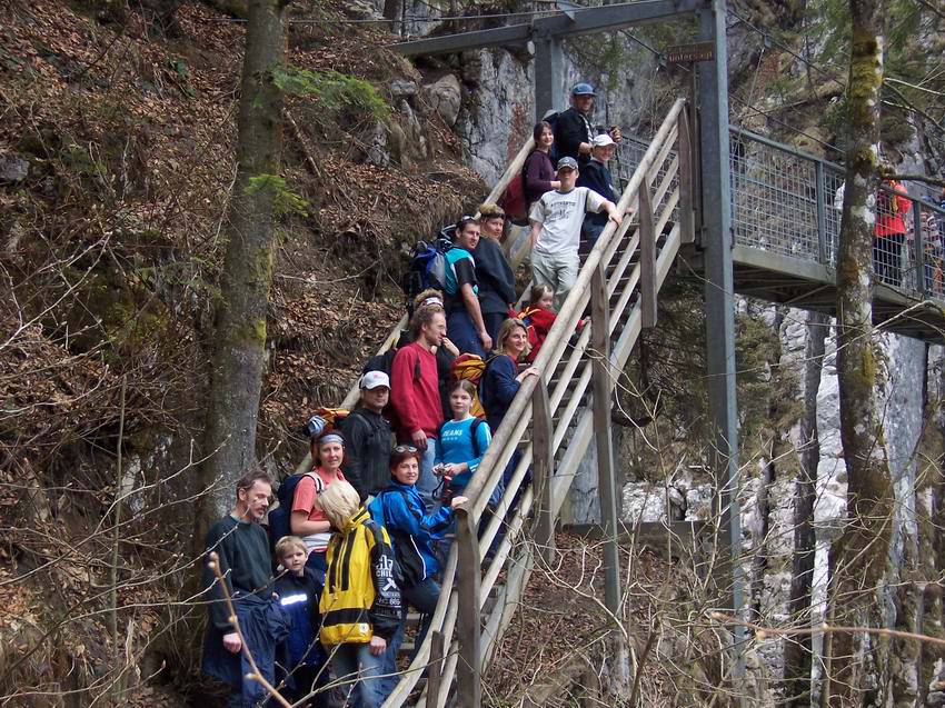 Wegen schlechtem Wetter musste diese Tour um eine Woche verschoben werden, was sich allerdings gelohnt hat. Sechs Väter und eine Mutter – jeweils mit ihren Kindern, nutzten das schöne Wetter und fuhren zum Plombergstein. Vom Parkplatz am Wolfgangsee machten wir uns auf den nicht so leicht zu findenden Weg durch eine Siedlung zum Plombergstein. Der Tourenleiter war sichtlich erleichtert als es endlich ins Gelände ging, wo die Wegfindung deutlich leichter war. Durch die wilden und dunklen Steinklüfte und Höhlen ging es zum Gipfel, wo Brotzeit gemacht wurde. Die Kinder waren fast nicht mehr zu bremsen, lockte doch der Klettergarten für die ersten Kletterversuche der Familiengruppe. Nachdem alle Kinder ihre Klettergurte angelegt hatten und die Seile eingehängt waren, ging es endlich los. Voller Begeisterung erklommen alle mehrmals die Felsen. Wieder zurück am See nutzte die Gruppe das schöne Wetter noch zu einem Bad im ganz schön kalten Wolfgangsee, bzw. im noblen Yachtclub zum Kaffeetrinken.