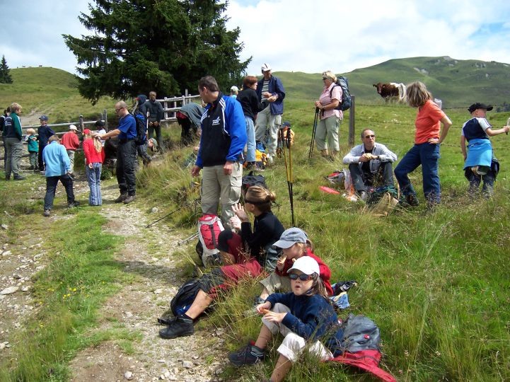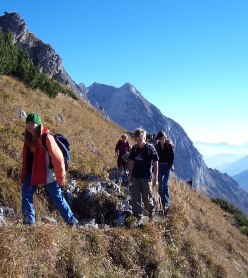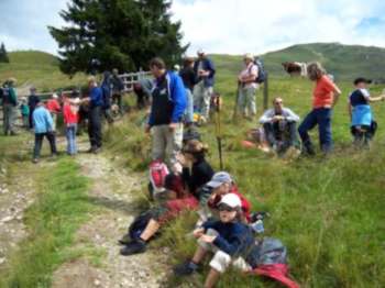 Bei bester Laune machten wir uns von Hinterbrand über die Mitterkaseralm auf den Weg zum Schneibsteinhaus (1 668 m) . Im gemütlichem Tempo und mit ausreichend Pausen kamen auch die Kleinsten voller Freude dort an. Der größte Teil der Teilnehmer blieb dort und ließ sich die Sonne auf den Bauch scheinen. Die restlichen gipfelhungrigen Teilnehmer stürmten im wahrsten Sinne des Wortes den Schneibstein (2 276 m) , wo sie etwas außer Atem jedoch glücklich die Aussicht genossen. Nachdem Abstieg wurden sie bereits von der Musik zünftig empfangen. Dem Hüttenzauber bis zur späten Stunde stand nun nichts mehr im Weg. Am nächsten Morgen noch etwas müde ging es über Stahlhaus, Hausgipfel und einer Rast auf der Mitterkaseralm (1 705 m) , wo die Musiker zum Abschied nochmals kräftig aufspielten, wieder ins Tal hinab. Bei dieser Sektionstour beteiligte sich die Familiengruppe mit neun Familien (30 Personen).