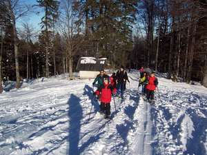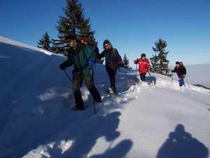 An reichlich Schnee mangelte es an diesem Wochenende nicht, hatte es doch bis Freitag jede Menge geschneit. Die Schneeschuhgeher wählten daher wegen der Lawinengefahr den sicheren Weg über die tief verschneite Forststraße und nicht wie geplant über die Hundsdorfalm. In der gemütlichen Selbstversorgerhütte bestens betreut und beheizt vom schon über 90-jährigen Hüttenwart, fühlten sich alle sehr wohl. Mit Spaghetti und Tomatensoße und was sonst noch alles im Rucksack Platz hatte, wurde gemeinsam ein leckeres Abendessen zubereitet Mit Spielen und so mancher Anekdote des Hüttenwartes war für einen kurzweiligen Abend gesorgt. Am Sonntagmorgen machten sich 4 Frühaufsteher mit Tourenskiern und Schneeschuhen auf den Weg, um den Sonnenaufgang am Bischling zu erleben.