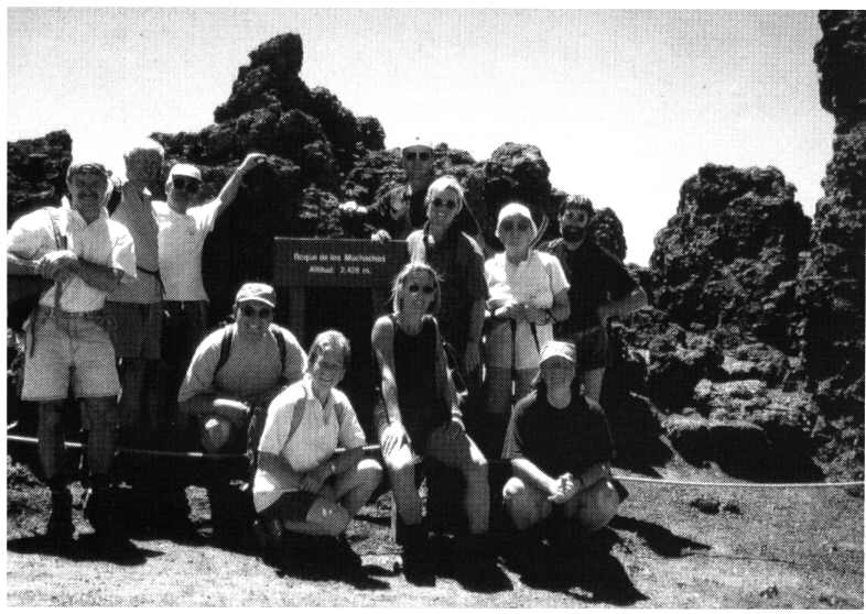 ![]() Nach unserer Ankunft wurde am späten Nachmittag in der „Hacienda San Jorge“ an der Ostküste Quartier bezogen, unserem Stützpunkt für die ganze Woche. Da sich der nächste Tag mit wolkenlosem Himmel präsentierte, wurde der Roque de los Muchachos, mit 2.426 Metern die höchste Erhebung der Insel, unser Ziel. Am Rand der Caldera de Taburiente ging es über einen phantastischen Höhenweg zum Gipfel. Der weite Ozean und Teneriffas Heide fesselten den Blick. Wir genossen die Aussicht in die Caldera, bewunderten bizarre Felsformationen, das bunte Gestein und vergaßen darüber, wie unbarmherzig die Sonne auf unsere Wadeln schien. |