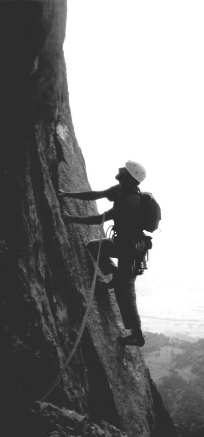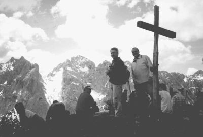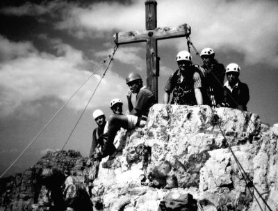 Wieder einmal der gleiche Wetterbericht für das Wochenende. Samstag schön - Sonntag schlecht. So mußten wir schweren Herzens auf die Zweitagestour zum Großen Teufelshorn verzichten und entschädigten uns am Samstag mit keinem geringeren als dem Hohen Dachstein. Den Anstieg wählten wir über die versicherte „Schulter“ einen schönen, aber nicht schwierigen Klettersteig. Der nicht versicherte Gipfelaufbau erforderte leichte Kletterei mit einigen Stellen im unteren zweiten Grad. Bei herrlichstem Wetter genossen wir die Gipfelrast. Den Abstieg nahmen wir über den leichten und mit Stahlseilen gesicherten Westgrat. Anschließend querten wir den oberen Gosaugletscher und stiegen über eine senkrechte Wandstufe zur Steinerscharte auf. Der Weiterweg zur Dachsteinwartehütte, auf der wir uns einige Bierchen genehmigten, erforderte nur noch gemütliches „Hatschen“ im Schnee. Insgesamt ein nicht sehr anstrengendes, aber wegen der großartigen Landschaft umso eindrucksvolleres Bergerlebnis. Am Sonntag war dann wie gemeldet schlechtes Wetter. |