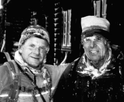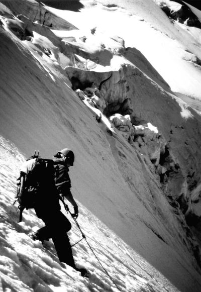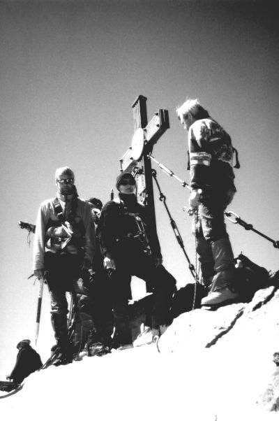 ![]() Schon beim Anstieg zur kleinen aber feinen Salmhütte begrüßte uns der Glockner mit Donnergrollen und leichtem Nieseln, was uns aber nichts ausmachte, da wir den Wetterbericht kannten. Nach einer Nacht in mehr als engen Lagern ging es am nächsten Tag frühmorgens in Richtung Hohenwartscharte, die auch die Erstbegeher als Anstieg zur Adlersruhe benutzt haben. Auf der Adlersruhe angekommen, mussten wir unseren ursprünglichen Plan, erst am Spätnachmittag aufzusteigen abändern, denn für den frühen Abend waren starke Gewitter und ein kleinerer Wettersturz angesagt. So ging es schon um 12.00 Uhr mittags (high noon) ab in Richtung Gipfel. Aufgrund der optimalen Eisverhältnisse machte der Anstieg über das steile Glocknerleitl mehr Spaß als Probleme. Da wir die Gipfelfelsen vollkommen eisfrei vorfanden, war auch der weitere Anstieg problemlos, da er nur die letzten Meter zum Hauptgipfel den unteren 2. Schwierigkeitsgrad erreicht. So war es allen Teilnehmern möglich, diesen schönen Erfolg und vor allem die grandiose Aussicht zu genießen. Nach dem Abstieg zur Adlersruhe, auf der wir übernachteten, stellte sich das Schlechtwetter relativ schnell ein. Kein Wunder, dass der Gletscherabstieg über das Hofmannskees am nächsten Morgen eher schweigsam zurückgelegt wurde. |