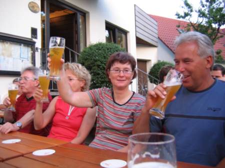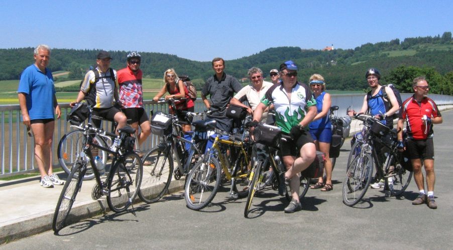 Start und Ziel war Kehlheim, die alte Herzogstadt am Zusammenfluss von Altmühl und Donau, bekannt durch Ihr Wahrzeichen, die Befreiungshalle. Da jedoch ein Messerstecher am Werk war und Hedis Radl, noch bevor sie einen Meter gefahren war, einen neuen Schlauch und Mantel benötigte, verzögerte sich der Start um eine Stunde. Höhepunkt unserer ersten Etappe war die ehemalige Reichsstadt Regensburg. Den weithin beherrschenden Mittelpunkt bildet der Dom St. Peter, das bedeutendste Bauwerk der Gotik in Bayern und die Steinerne Brücke. Natürlich haben wir auch Schloss Emmeran besucht. Fürstin Gloria und die Armenspeisung haben wir leider verfehlt. Entlang des naturbelassenen Naabtals erreichten wir nach ca. 70 km unser erstes Nachtquartier, die Klosterwirtschaft Pielenhofen direkt am Naabufer. Schon zeitig früh am nächsten Tag besuchten wir die „Perle des Naabtales“, so wird der Markt Kallmünz schon seit der Jahrhundertwende genannt. Wir nahmen uns Zeit, dieses Kleinod mit seinen mittelalterlichen Bauwerken ausführlich zu betrachten. Unser dritter Fluss, die Vils, mündet hier in Kallmünz in die Naab. Auf der alten Eisenbahnlinie, die zum Radweg umgebaut wurde, immer der Vils entlang näherten wir uns Amberg, der alten Hauptstadt der Oberpfalz. Die raue Liebenswürdigkeit der Oberpfalz konnte man ganz besonders in dieser abwechslungsreichen Landschaft mit kleinen verträumten Dörfern und alten Städten spüren. Über Sulzbach-Rosenberg, nach ca. 100 km Wegstrecke gelangten wir nach Pommersbrunn zu unserem Quartier. Der dritte Tag versprach wiederum eine hochsommerliche Temperatur von 33 °C und so machten wir uns bei bester Stimmung auf über Hersbruck und Lauf in Richtung Nürnberg. Unser vierter Fluss, die hier noch junge Pegnitz, war unser neuer Wegbegleiter. Höhepunkt dieses Tages war eine Altstadtrundfahrt mit Burgbesichtigung in Nürnberg. Der nächste Abschnitt führte uns direkt an den Ludwig-Donau-Main-Kanal. Diese 172 km lange Wasserstrasse war eine Verbindung zwischen Schwarzen Meer und Nordsee. Auf einen Sandweg direkt neben den Kanal kamen wir durch ein wundervolles, ruhiges Stück Natur und konnten die Fauna und Flora so richtig genießen. Müde und ausgetrocknet erreichten wir, über einige kräftige Oberpfälzer Buckeln nach gut 100 km Neumarkt, wo wir wieder bestens untergebracht waren und den Flüssigkeitsverlust des Tages im Wirtsgarten mit gutem Oberpfälzer Bier ausglichen. Auf hügligen Nebenstrassen durch kleine Bauerndörfer und über Berching und Beilngries mit schönem, altem, historischem Stadtkern erreichten wir am vierten Tag unsern letzten Fluss, die Altmühl. Kräftig in die Pedale treten hieß es zum Aufstieg nach Sülzburg, gut 170 m höher als die Umgebung. Zum Schluss 20 % Steigung auf Kopfsteinpflaster bei 30 °C, da floss der Schweiß. Ein Rundblick ins Land und die folgende Einkehr in einem schattigen Biergarten entschädigten die Mühen. Bald erreichten wir Dietfurt an der Altmühl und somit unser letztes Quartier. Ein erfrischendes Bad in der weißen Laaber kühlte die heißen Wadeln der müden Radler. Die letzte Etappe führte uns durch das idyllische Altmühltal, vorbei an Schlössern und Burgen nach Kehlheim. Die letzten Kraftreserven waren noch nicht verbraucht und so machten wir einen Abstecher nach Schloss Prunn auf einen Steilfelsen hoch über dem Tal. Die Einmaligkeit der Burganlage, die traumhafte Aussicht und der schattige Biergarten entschädigten für den steilen Aufstieg. Vorbei am fotogenen Ort Essing und der Burg Randeck schloss sich an der Mündung Altmühl-Donau für 15 müde aber zufriedene Radler nach 375 km der Kreis der fünf Flüsse Radtour.