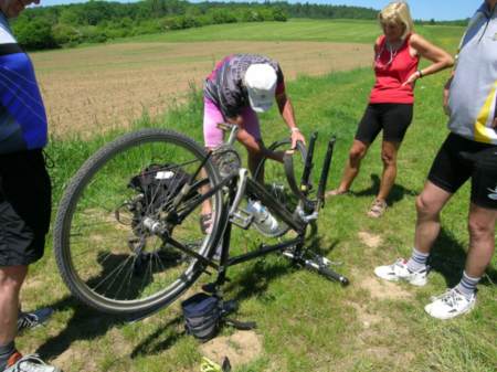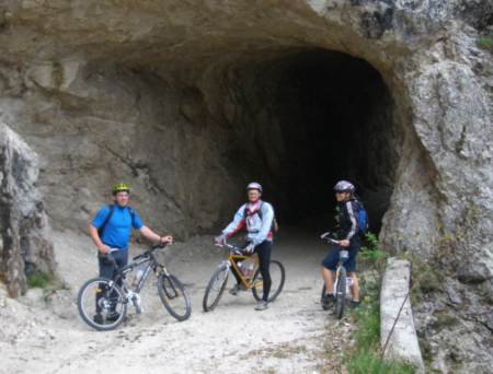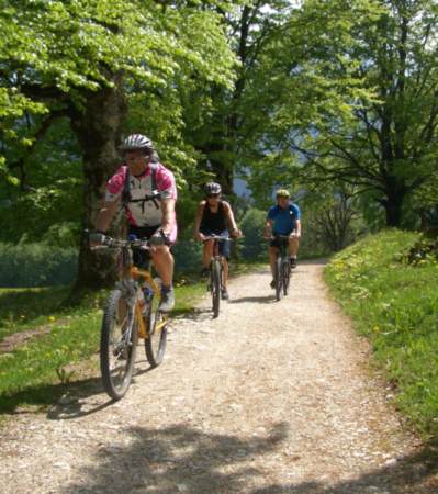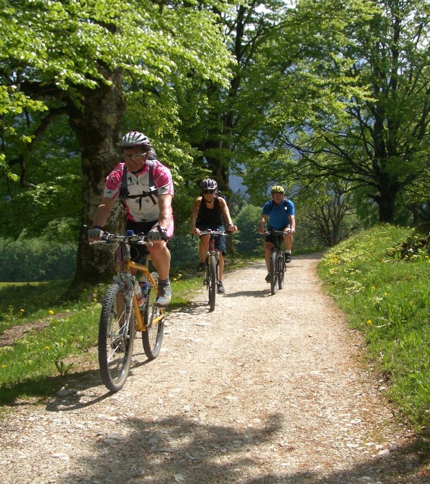 Eine kleine aber leistungsstarke Gruppe meldete sich zur ausgeschrieben Spielbergtour an. Warum also unter unserem Leistungsstand bleiben? Somit legten wir die Anforderungen ein wenig höher und suchten uns eine anspruchsvollere Tour aus. Mit der Tour um das Bergmassiv Reiter-Alm, fanden wir unser ideales Gebiet. Von der Seilbahn der Bundeswehr aus begann unser 50 km und 1.200 Höhenmeter langer Rundkurs. Gleich zum Anfang galt es einige Höhenmeter zu überwinden. Doch schon bald folgte eine schöne und mit Felstunnel gespickte Abfahrt nach Reit bei Unken. Nun ging es über einen schmalen Pfad nach Scheffsnoth bei Lofer. Die Einsamkeit hatten nun ein Ende, denn auf den Weg nach Sankt Martin entlang der Saalach kamen uns einige Radler entgegen. Doch beim 500 Hm langen Anstieg zum Gasthaus Hirschbichl war nur das Schnaufen der 4 köpfigen Gruppe zu hören. Bei strahlendem Sonnenschein floss der Schweiß in Strömen. Somit wurde die Gelegenheit genutzt im Berggasthof Hirschbichl den Flüssigkeitshaushalt wieder auszugleichen. Was war hier eigentlich mit der Gruppe los? Ein jeder außer dem Tourenleiter bestellte Kaffee! War der vorangegangene Anstieg nur für den Tourenleiter zu schweißfordernd? Egal, letztendlich waren wir alle am höchsten Punkt der Tour. Anschließend folgte die rasante Abfahrt Richtung Hintersee. Mit einer Höchstgeschwindigkeit von über 60 km/h schnurrten die Räder talwärts auf der asphaltierten Straße. Lediglich der Hochzeitsstein bremste die Gruppe. Letztendlich traute sich niemand diese Herausforderung anzunehmen. Die Idylle des Hintersees nutzten wir um uns unsere im Rucksack befindliche Brotzeit schmecken zu lassen. So gestärkt war der weitere Weg zu unserem Ausgangspunkt ein Kinderspiel.