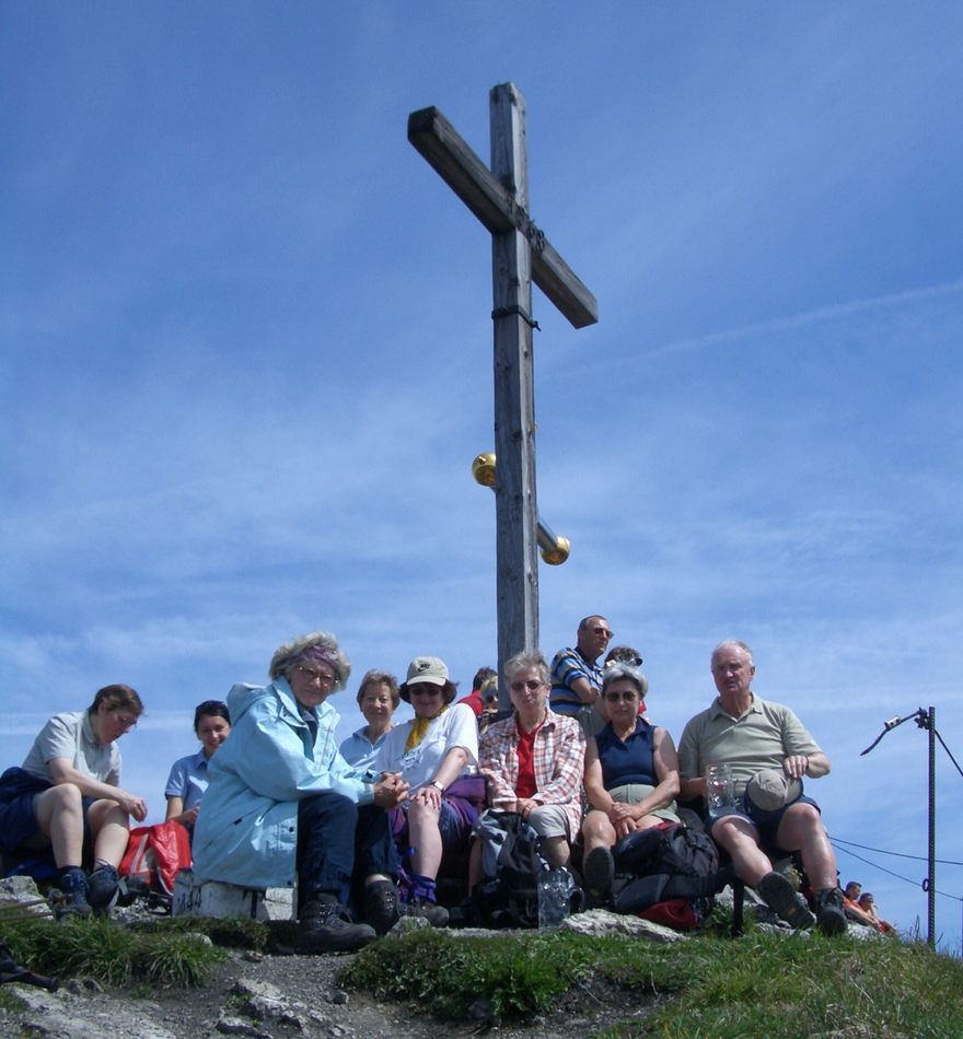 17 Teilnehmer warteten auf den 1. Mai um die diesjährige Wandersaison in den Bergen zu eröffnen. Bei bereits sommerlichen Temperaturen gingen wir aus dem Trockenbachtal über den Geißgraben zu Otten- und Spandaualm. Auf etwas steilerem Weg in Serpentinen erreichten wir bald darauf die Kranzhornalm, die wir aber noch vorerst links liegen ließen. Die letzten Anstiegsmeter hinter uns gelassen, standen wir hoch über dem Inntal auf dem Gipfel des Kranzhorns, mit seinen zwei Gipfelkreuzen. Wir genossen die gute Aussicht, die mitgebrachten Brotzeiten und die Radlermaßen. Der Abstiegsweg führte uns wiederum an der Kranzhornalm vorbei, doch diesmal gingen wir nicht daran vorbei. Nach einer ausgiebigen Rast auf der Alm ging es über Bubenaualm zurück ins Tal.