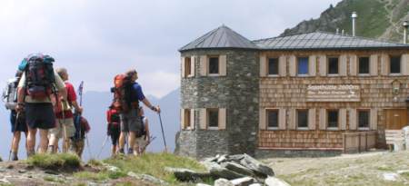Ausgangspunkt war der Ortsteil Bichl im hintersten Virgental. Über erstaunlich steile Südhänge marschierten wir in knapp drei Stunden durch wunderschöne Blumenwiesen zur Sajathütte (2 600 m) . Dieses Quartier trägt nicht ganz zu unrecht den Beinamen „Das Schloss in den Bergen“. Im Frühjahr 2001 war die alte Hütte durch eine riesige Lawine vollkommen weggeputzt worden. Durch eine unglaubliche Energieleistung der Familie Kratzer wurde der Neubau bereits im Herbst 2002 in Betrieb genommen. Ein nagelneues Refugium mit Hütten-athmospähre. Den Nachmittag nutzten wir für die Ersteigung der Roten Saile (2 832 m) über den Klettersteig, da das angekündigte Schlechtwetter um die Hohen Tauern einen großen Bogen gemacht hatte. Unter Anleitung und mit Trompetenunterstützung durch Hans Ganghofer übten wir am Abend sogar einige Berglieder. Na ja! Am nächsten Morgen war vom Regen noch nicht viel zu sehen und so machten wir uns auf den Gipfelweg. Höhepunkt beim Anstieg war eine rund hundert Meter hohe fast senkrechte Felswand, die auf Bändern und mit Drahtseilen gesichert überraschend leicht zu durchsteigen war. Und schon standen wir auf unserem ersten Gipfel, dem Schermeskogel (3 046 m) . Nur noch ein Katzensprung trennte uns nun von der Kreuzspitze. Ausgerechnet am Gipfel fing es an zu regnen und der kalte Wind kühlte uns deutlich aus. So hielt sich die Gipfelrast in Grenzen und wir machten uns auf den Weg hinunter ins Dorfertal. In weltabgeschiedener Umgebung erreichten wir nach rund 1 ½ Stunden den Venediger-Höhenweg und nun war es nicht mehr weit bis zur Johannishütte, wo wir uns eine Brotzeit schmecken ließen. Beeindruckend war der weitere Abstieg entlang des wildreissenden Dorferbaches, der leider das Opfer eines Kraftwerkbaues wird. Über einen schönen Höhenweg ging es dann zurück nach Bichl und zu unseren Fahrzeugen.