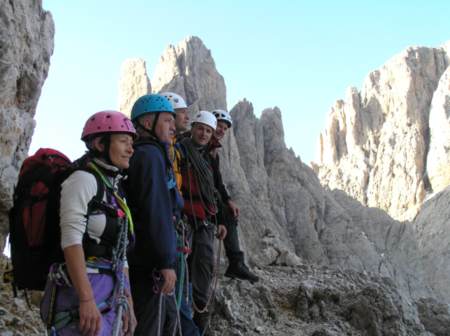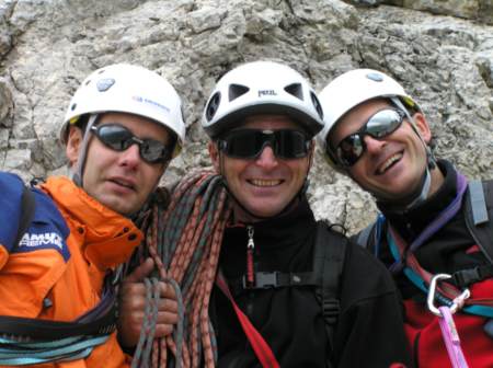 Bereits in den frühen Morgenstunden marschierten wir los zum Fassaner Band. Dieses wird immer steiler und schmäler, bis es sich schließlich in der Wand verliert. Ein kurzes Drahtseil half uns bei der letzten Querung in senkrechtem Fels zum Langkofelgletscher. Fast unglaublich, in einer solchen Wand ein so großes Kar vorzufinden. Weiter ging es in die berühmt-berüchtigte Eisrinne, die wir aufgrund der guten Schneeverhältnisse ohne Steigeisen überwinden konnten. Nun konnten wir die Kletterschuhe anziehen um im Fels der Führerrinne die Biwakschachtel zu erreichen. Erst hier, kurz unterm Gipfel lauerte am Roten Turm die Schlüsselstelle. Es ist eine Querung in steilem Fels im oberen dritten Schwierigkeitsgrad. Über einige Vorgipfel hinweg erreichten wir nach insgesamt 5 ½ Stunden den höchsten Punkt und genossen die grandiose Schau über die Dolomitengipfel bei bestem Bergwetter. Der Abstieg auf dem Anstiegsweg gestaltete sich entsprechend lang und schwierig. Zwischen den Abseilstellen mussten wir immer wieder in freier und ungesicherter Kletterei in steilem Gelände absteigen. Den Schlusspunkt setzte ein überhängender 50-Meter-Kamin, den wir in leichteres Gelände abseilten. Etwas müde erreichten wir nach 5 ½ Stunden Abstieg wieder die Langkofelscharte. Hüttenwirt Franz spendierte uns eine Runde Grappa als Anerkennung dafür, dass wir mit einer so großen Gruppe auf „seinem“ Langkofel waren, was eine absolute Seltenheit darstellt. Da die Seilbahn den Betrieb bereits eingestellt hatte, mussten wir den Abstieg zum Sellajoch zu Fuß zurücklegen, was bei diesem Tagespensum auch nichts mehr ausmachte. Im Tal trafen wir mit Grille und Markus zusammen, die mit uns in die Dolomiten gefahren waren und an den Sellatürmen zwei schwierige Klettereien durchgezogen hatten.