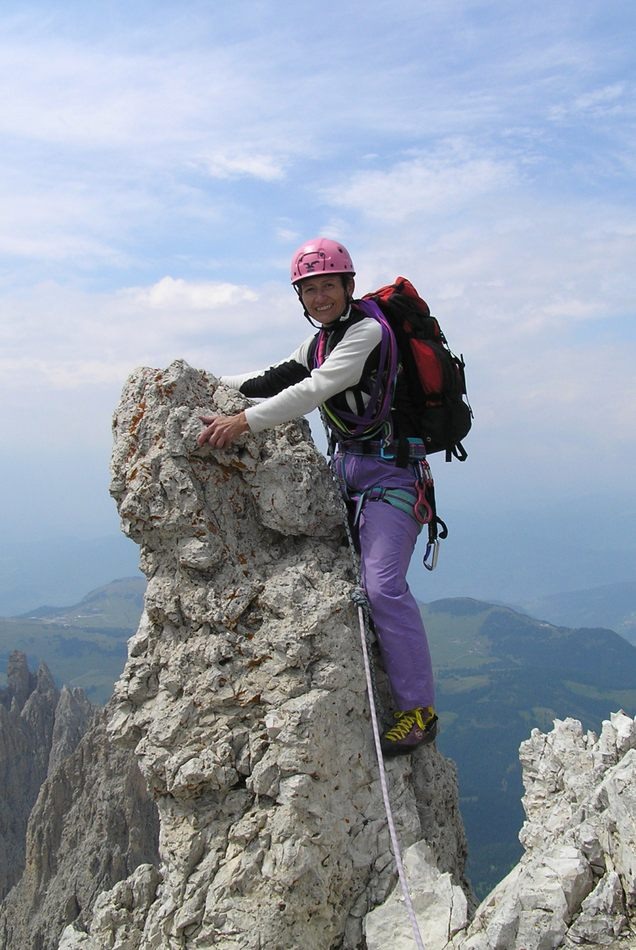 Bereits bei der Anfahrt durch das Grödner Tal begrüßte uns der Langkofel mit seiner bestechenden Form und machte kein Hehl daraus, dass zu seinem Gipfel kein leichter Weg führt. Überaus kraftsparend war allerdings der Zustieg zur Toni-Demetz-Hütte in der Langkofelscharte, den wir per Seilbahn zurücklegten. Zum Warmmachen genehmigten wir uns am ersten Tag die Daumenkante an der Fünffingerspitze. Obwohl eine der ausgesetztesten Kantenklettereien der Dolomiten wird der vierte Schwierigkeitsgrad nie überschritten. Für die meisten Teilnehmer war es die erste Bekanntschaft mit dem steilen Dolomitenfels. Nach der grandiosen Abseilfahrt über den so genannten „Demetz-Fahrstuhl“, die wir bei Graupelschauer und Gewitter zurücklegten, waren alle begeistert. Der Hüttenabend war kurz und trocken – schließlich hatten wir uns für den nächsten Tag einiges vorgenommen.
