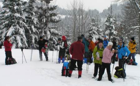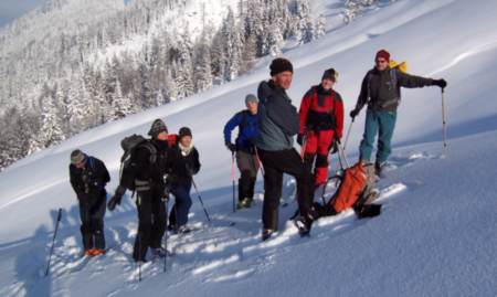Eigentlich wollten wir ja vom Waldparkplatz an der Sudelfeldstrasse zum Kleinen Unterberg gehen. Aber der Wetter- und Lawinenlagebericht war einfach saumä-ßig. So entschlossen wir uns für den Anstieg über die Rodelbahn in Richtung Brünnsteinhaus. Der Wetterbericht hatte aber nicht gestimmt. Die Witterungsver-hältnisse waren sogar hervorragend. Und so ließen wir das Brünnsteinhaus ganz einfach rechts über uns liegen und gingen weiter in Richtung Großer Traiten. Diesen Gipfel kann man allerdings um diese Jahreszeit mit Schneeschuhen nicht erreichen. So begnügten wir uns mit dem schönen Aussichtspunkt Steilner Joch (das kennt wirklich keiner) und gingen dann zurück zum Brünnsteinhaus, mit ei-nem überaus fröhlichen Wirt. Wegen großer Lawinengefahr und schlechtem Wet-ter hatten wir auch diese Tour um eine Woche verschieben müssen. Trotzdem waren vierzehn Teilnehmer dabei, die ihre Unternehmungslust mit Sicherheit nicht bereuten.