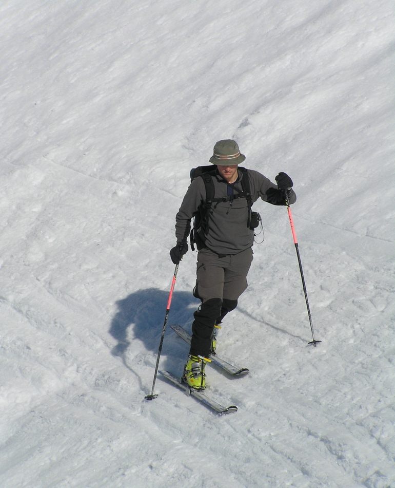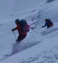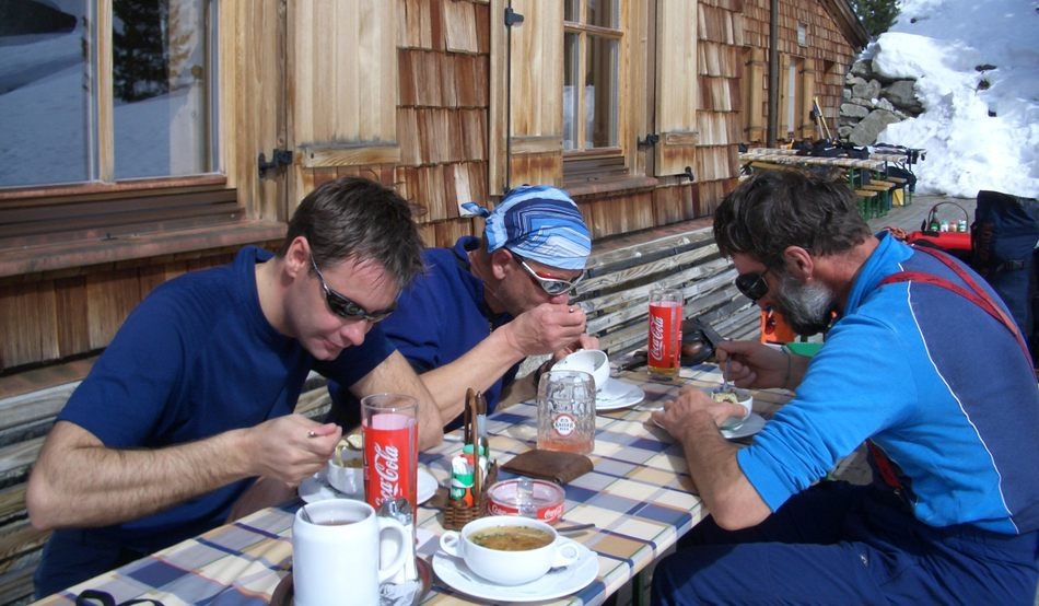 Nach massiven Schneefällen im Nordalpenbereich und einem Warmlufteinbruch war die Lawinensituation mehr als kritisch. So entflohen wir ins Hochgebirge der Norischen Alpen, die mit prächtigen Skitourenverhältnissen aufwarteten. Nach einem leicht depressiven Anstieg zur Postalm bei Nebeldrücken und schwachen Nieselregen sollte sich die Stimmung aber rasch ändern. Nach einem Dreigängemenü mit Bier und Rotwein fielen wir in einen tiefen Schlaf und am, nächsten Tag spurten wir bei bärigem wolkenlosem Himmel hinauf zum Südlichen Sonntagskopf (3 020 m) . Hier blies uns ein eisiger Wind ins Gesicht, so entschieden wir uns die Brotzeit ein wenig später einzunehmen. Also fuhren wir ca. 500 Hm bei besten Schneebedingungen, super Pulverschnee, einen fast unverspurten Hang hinunter. Nach einer kurzen Rast am Hang, die Grille ausgiebig nutzte, um mit seiner neuen Plastikschaufel ein ca. 1,80 m tiefes Schneeloch zu graben, stiegen wir wieder auf, um die tollen Hänge noch einmal so richtig auszukosten, die dem Namen „Silbersattel“ alle Ehre machten. An der Postalm angekommen erwartete uns ein opulentes Mahl. So konnten wir frisch gestärkt am nächsten Tag den Anstieg zur Schlieferspitze (3 289 m) wagen. So begann dieser Tag wie der letzte auch, zeitig in der Früh. Anfangs war der Anstiegsweg der gleiche wie am Vortag. Ab dem Skidepot in ca. 3 100 m Höhe stiegen wir bei leichter Blockkletterei und über einen ausgesetzten Schneegrat zum kleinen Gipfelplatz, der aber mit einer umso grandioseren Aussicht bis weit ins Südtirolerische aufwartete. Wieder lockte uns eine gigantische Abfahrt runter zur Postalm mit ihrer Sonnenterasse mit Gletscherblick, wo wir diese beiden schönen Tage gemütlich ausklingen ließen.