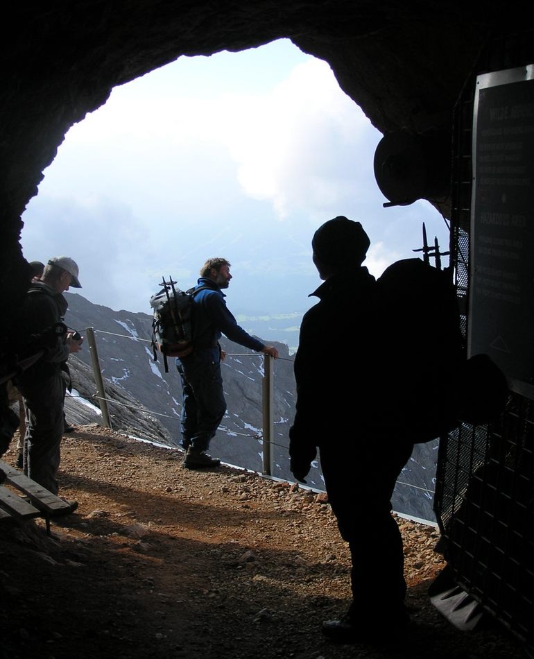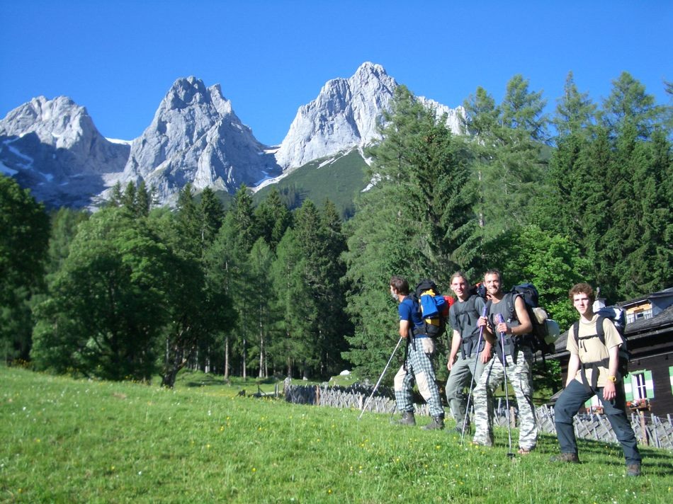 Der Klassiker schlechthin im Dachsteingebiet stand auf dem Programm. Da eine ausgefüllte Tagestour vor uns lag, verkürzten wir den Anstieg durch die Seilbahn. Der Austriaschartenweg führte uns durch den Rosmarie-Stollen zum Edelgrießgletscher und weiter zur Edelgrießhöhe. Hier verließ uns die beiden Kletterer Franz und Grille und wir stiegen zur Niederen Gamsfeldspitze. An dieser Stelle begann nun der eigentliche Klettersteig und wir legten Gurt, Helm und Klettersteigset an. Über den folgenden Grat auf- und absteigend erreichten wir den Gipfel der Hohen Gamsfeldspitze. Steil bergab, den Schmiedstock an der Südseite umgehend, kraxelten wir über die rampenartige mit Klammern gut ausgestattete Steilrinne wieder zurück auf dem Kamm, der uns weiter zur Schleichenspitze führte. Weiter ging es den Drahtseilen entlang zur Hohen Rams und auf teilweise versichertem Gehgelände stiegen wir zur Gruberscharte ab. Unsere Kletterer, welche die Routen am Landfriedstein erkundeten, stießen an dieser Stelle wieder zu uns. Gemeinsam kamen wir am Gutten-berghaus an. Nach dieser sportlichen Unternehmung sollte am nächsten Tag der landschaftliche Genuss nicht zu kurz kommen. Sonnenschein und blauer Himmel trugen ihren Teil dazu bei. Von der Feisterscharte nahmen wir den Sinabel, eine schöne Aussichtskanzel, in Angriff. Beim Ab-stieg wählten wir bewusst den längeren Weg durch das wild-romantische Höll- öder Seetal zum Silberkarsee. Mit einer ausgiebigen Rast an seinem Ufer wappneten wir uns für den kurzen Gegenanstieg, um anschließend auf steilen Pfaden dem Tal entgegen zu steigen.