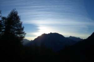 Die Werfener Hütte (1 969 m) bot sich für unser Kletterwochenende an, da sie direkt mit wuchtigen Felsmassiven umgeben ist. Der Aufstieg zur Hütte musste im leichten Regen absolviert werden. Nur langsam wurde das Wetter besser. Da unser Tatendrang nicht vor dem Nieselregen halt machte, stiegen wir in die hüttennahe Kletterroute mit dem Namen „Fun in the Sun“ ein. Obwohl sich kein Sonnenschein blicken ließ, hatten wir trotzdem unseren Spaß. Stellen im vierten Schwierigkeitsgrat galt es zu überwinden: Bei diesen Bedingungen eine echte Herausforderung. Nichtsdestotrotz wurde diese Route sturzfrei absolviert. Erst am späten Nachmittag kehrten wir zur Hütte zurück und konnten aufgrund der Wetterbesserung das Abendessen auf der Hüttenterrasse einnehmen. Zusehends füllte sich die Hütte. Das Gepäck der anwesenden Bergsteiger verriet uns, dass wir heute den Tiroler Brauch des Sonnwendfeuers miterleben durften. Nach Einbruch der Dunkelheit war es dann so weit. Nach und nach leuchtete ein Feuer nach dem anderen auf. Mit Glühwein (es war eine kalte Nacht) in der Hand, genossen wir diesen Anblick. Spät gingen wir ins Bett, dementsprechend kamen wir am sonnigen Sonntag aus den Federn. Nach dem Frühstück ging es zum Großen Fieberhorn. Hier wartete die Tour „Panorama“ im oberen fünften Schwierigkeitsgrad auf Georg, Simon und Marcel. Zur gleich Zeit bestiegen Markus und Grille eine Route am Hiefler im siebten Schwierigkeitsgrad. Nach Beendigung der Klettertouren trafen sich beide Gruppen wieder am Ausgangspunkt, um den Abstieg ins Tal anzutreten.