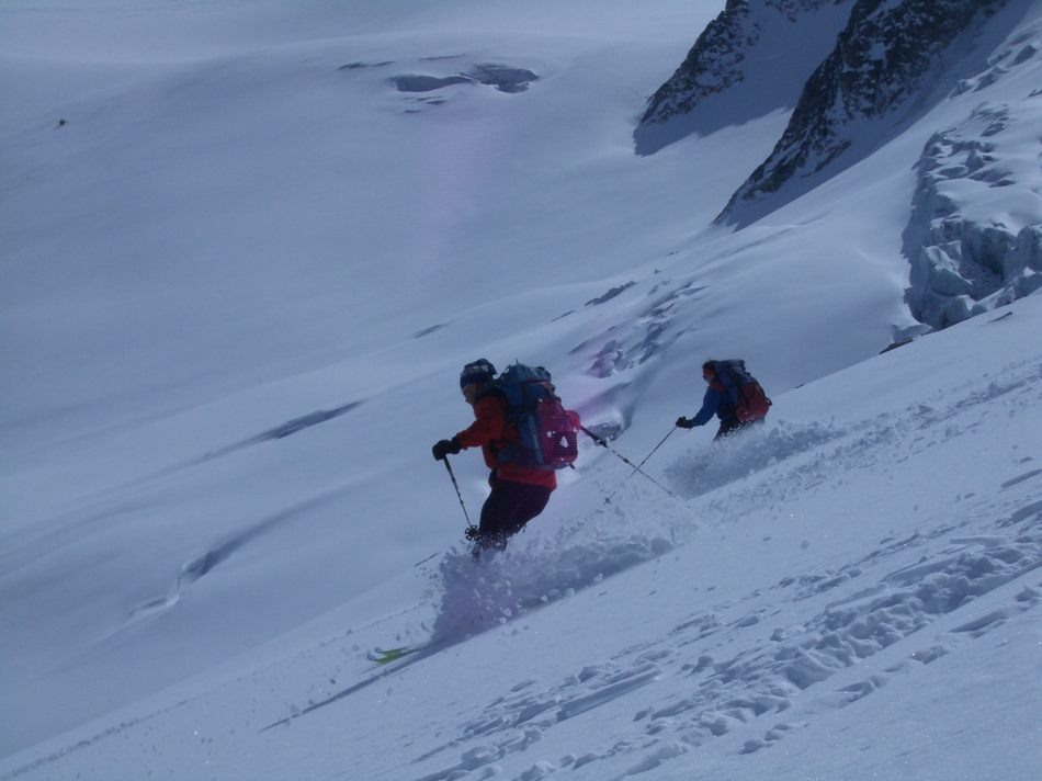 Die Wettervorhersage war für die eigentliche Wochenendunternehmung miserabel. Gerade mal für den Samstag wurden noch günstige Wetter-bedingungen vorhergesagt. Wir setzten alles auf eine Karte und fuhren dennoch. Unser Plan hieß Hütten- und Gipfelanstieg an einem Tag. Ein Stau in Ischgl, ausgelöst durch ein Mountainbikerennen, machte das Unternehmen zusätzlich spannend. Kurz vor Mittag kamen wir auf der Wiesbadener Hütte (2 443 m) an. Nur kurz war die Mittagsrast und schon ging es weiter über das Wiesbadener Grätle, welches unsere klettertechnischen Fähigkeiten forderte. Am Ochsentaler Gletscher sahen wir zum ersten Mal den Gipfel des Piz Buin. Doch an der Buinlücke (3 054 m) verschwand unser Ziel in dichter Bewölkung und Schneefall brach über uns ein. Sollte das vorhergesagte Schönwetterfenster gerade zusammengebrochen sein? Wir wollten nichts riskieren und traten bei diesen Bedingungen den Rückweg zur Hütte an. Nach einer kurzen Wegstrecke schoben sich die Wolken auseinander und der Gipfel zeigte sich wieder. Zu spät für uns. Dies Launen des Wetters machten wir nicht länger mit und gingen zur Hütte zurück. Am nächsten Tag setzten wir unter Schneetreiben unseren Abstieg fort.