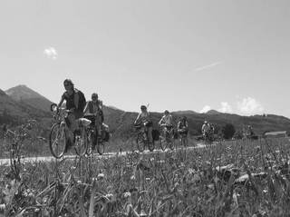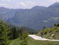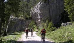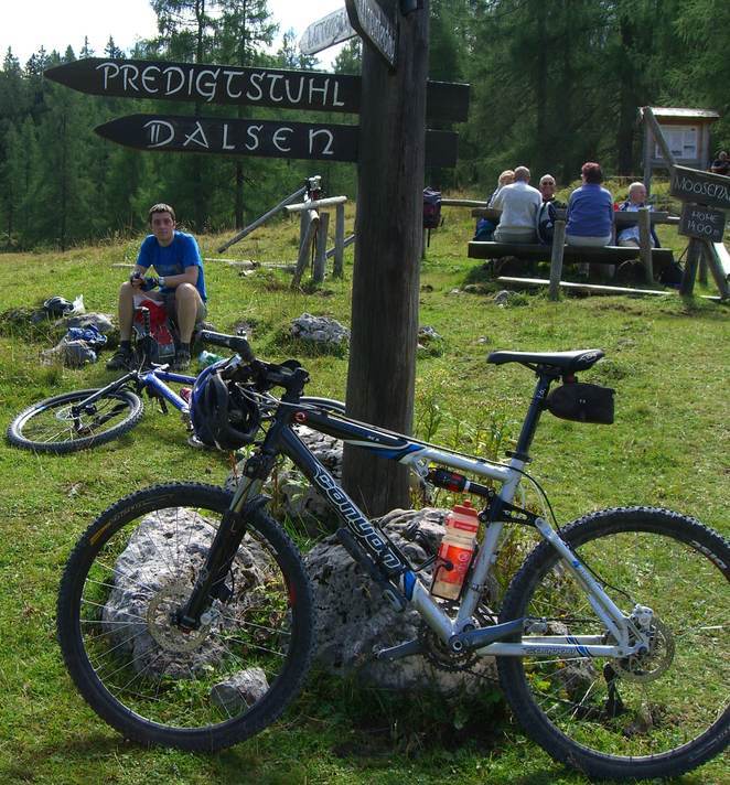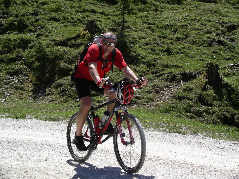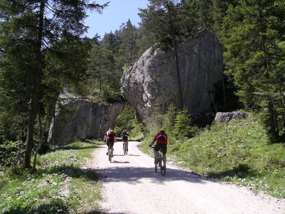 Es sah doch ein wenig nach Radrennen aus. Zuerst das Warten am Start, nicht auf den Startschuß, sondern auf den Tourenleiter. Ein (nur anfangs) kühles und regnerisches Wetter: „Zieh ich die lange Hose an, oder starte ich gleich in der Kurzen?“. Man könnte ja Zeit beim Umziehen verlieren, oder gar zu viel Gewicht mitschleppen. Nein es war kein Rennen, sondern eine zwar lange, aber umso abwechslunsreichere und in jeder Hinsicht lohnende Rundtour durchs nördliche Rofan. Und die lange Hose haben wir zu Recht im Auto gelassen. Schaut man die Route an, könnte man meinen, wir wollten Almen sammeln: Eilalm – Labeggalm – Enteralm – Schmalzklausenalm – trotz aller Almen eine gemütliche Rast an der Steinberger Ache – und über die Aschaumahdalm zurück zum Ausgangspunkt. Zu allerletzt gabs dann doch noch einen kleinen Wettstreit, sozusagen ein familieninterner Sprint über die letzte Anhöhe.
