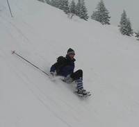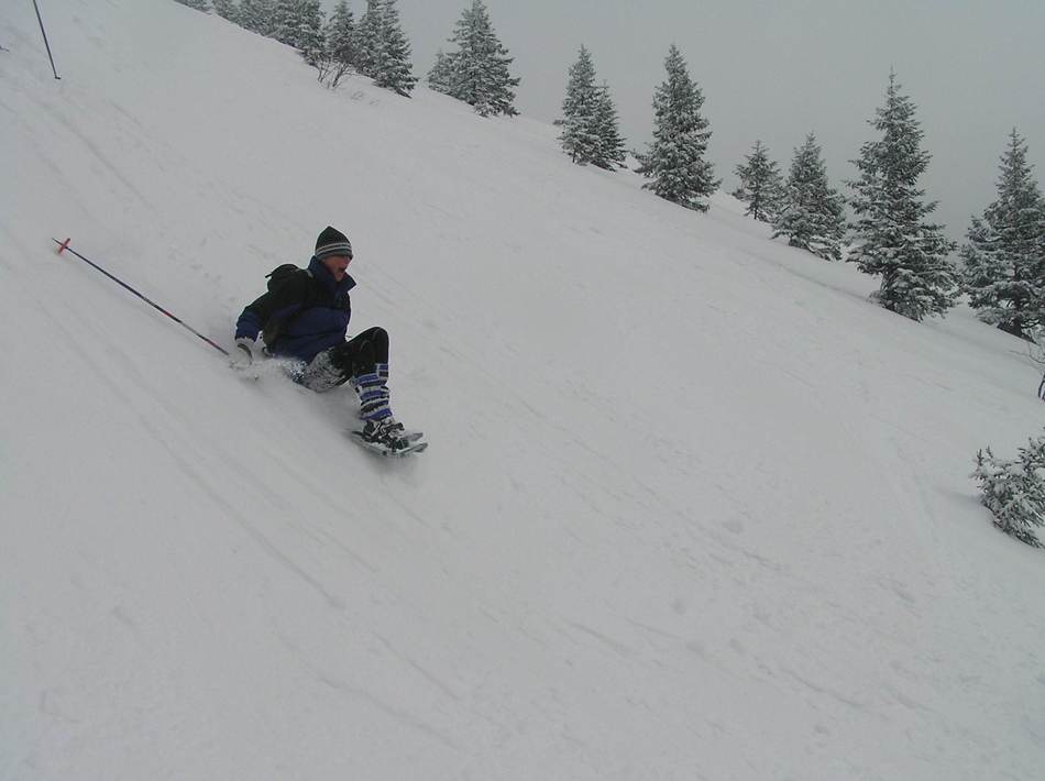 Doch nun galt es noch den Abstieg zu bewältigen. Vorbei an der vollkommenen zugeschneiten Gotzenalm wollten wir auf der Forststrasse absteigen. Denkste! Von dieser war wegen der gewaltigen Schneemengen nicht einmal ein Ansatz erkennbar. Also wählten wir den geradesten Abstieg, welcher aufgrund des Geländes zu manchem unterhaltsamen Sturz führte. Dann ging es wieder in unserer Aufstiegsspur zurück, gewürzt mit einem kleinen aber gemeinen Gegenanstieg. Nach rund acht Stunden reiner Gehzeit kamen wir zwar sichtlich ermüdet, aber mindestens genauso glücklich zu unserem Ausgangspunkt zurück.