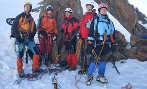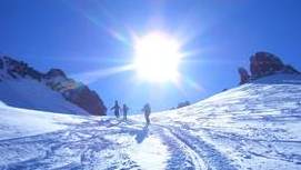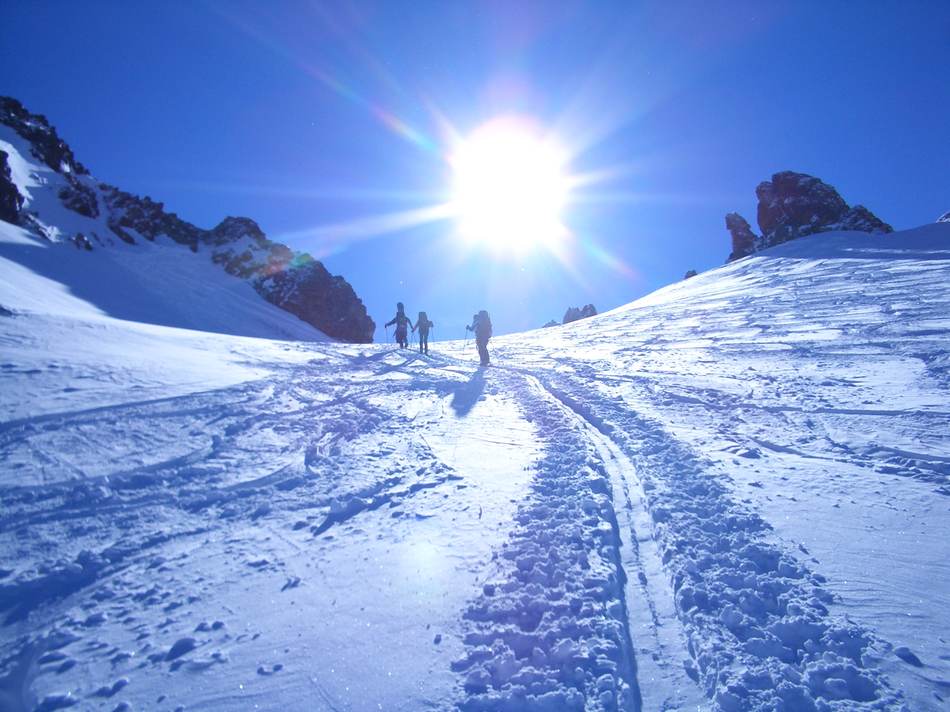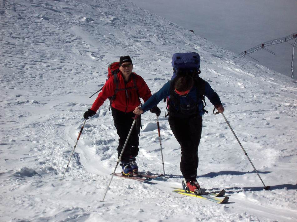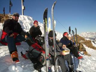 Am Montag wendete sich das Blatt: Schon frühmorgens war vom Wolkenvorhang nicht das Geringste übrig. Laut Hüttenwirt war das der erste schöne Tag seit einem Monat. Leider war es immer noch so kalt, dass die Klebekraft unser Felle versagte. Mit allerhand Tricks (Kabelbinder, Hansaplast und Ski-Fix) konnten wir die widerspenstigen Felle aber doch an ihrem Platz halten und dem Weg zum Piz Buin stand nichts mehr im Weg. Von der Buin-Lücke ab wurde die Sache alpin, so dass Pickel und Steigeisen (oder auch die Zacken der Schneeschuhe) gute Dienste taten. Unser Blick reichte vom Ortler über die Bernina bis zu den Vorbergen Richtung Bodensee. Gerüchte, dass der Kajetan seinen Balkon in Lindau sehen konnte, sind unbestätigt. Aufgrund der immer noch angespannten Lawinensituation verzichteten wir auf die Traumabfahrt zur Tuoi-Hütte auf Schweizer Boden und zogen den Rückweg nach Austria zur Wiesbadener Hütte vor.