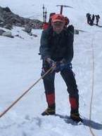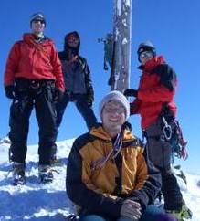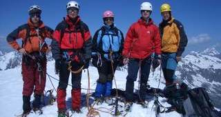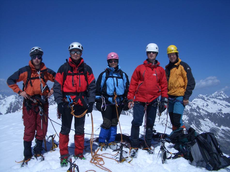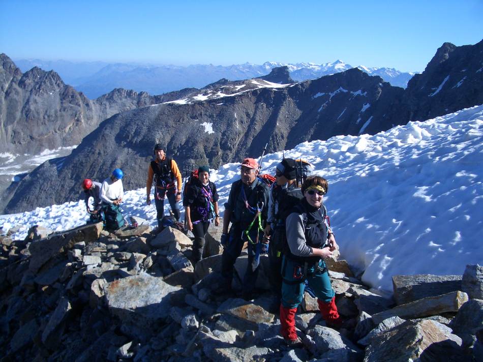 Von hier aus ging es über den Laaser Ferner rückseitig um die Vertainspitze herum zum Rosimjoch. Da sich die warmen Temperaturen auch in der Nacht fortsetzten, gestaltete sich die Querung des Laaser Ferner im knietiefen Nassschnee anstrengend. Die letzten Höhenmeter ging es über Blockgestein den Süd-West-Grat zum Gipfel empor. Die Gipfelaussicht war grandios. Erst jetzt fiel uns auf, dass weit und breit keine anderen Gipelaspiranten zu sehen waren. An diesem Tag gehörte der Gipfel den Eggenfeldener. Nach einer knappen Stunde Gipfelrast ging es an den Abstieg zum Rosimjoch und weiter über den Rosimferner und einem schier nie enden wollenden Weg zur Hütte. Nach einer 10-stündigen Tour kamen wir erschöpft aber glücklich an der Düsseldorfer Hütte an. Am folgenden Tag lautete unser Ziel Große Angelusspitze. Über die Reinstadlerroute erreichten wir über einige leichte Kletterpassagen den Firngrat zum Gipfel. Dank unserer guten Kondition, konnten wir einen Vorsprung zu den nachkommenden Seilschaften aufbauen, welcher die Einsamkeit auch an diesem Gipfel zur Folge hatte. Erst beim Abstieg begegneten wir den uns entgegenkommenden Bergsteigern. Nach einer kurzen Rast zu einem „Leps“ auf der Düsseldorfer Hütte setzten wir den Abstieg ins Tal fort. Ein letzter Gruß von Hermann zu „seinem“ Ortler und wir fuhren aus dem Tal heimwärts.