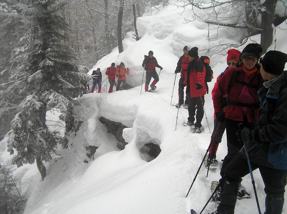 Obwohl der Wetterbericht alles andere als eine Hochdrucklage vorhergesagt hatte, machten wir uns auf den Weg zum Filbling. Was bei der bescheidenen Höhe dieses Gipfels nicht gerade als Wagnis zu bezeichnen ist. Bereits nach kurzer Gehzeit tauchten wir in den Hochwald ein, der uns vor dem zunehmenden Wind schützte. Der einsetzende leichte Schneefall zauberte für uns ein Wintermärchen. So zogen wir unsere einsame Spur immer am Ostrücken entlang zum Gipfel. Die Rast fiel mangels Fernsicht recht kurz aus und wir machten uns sofort an den Abstieg in Richtung Filblingsee. Nach einer kurzen Pause im Hochwald mit Jagatee-Verkostung ging es an der Nordseite des Filbling entlang zurück zum Ausgangspunkt. Alles in allem eine wunderschöne Eingehrunde für diesen Schneeschuhwinter. Auf der Heimfahrt fing es stark an zu schneien, was die Vorfreude auf die nächsten Touren nur noch anheizte.