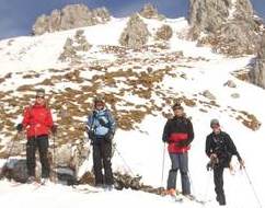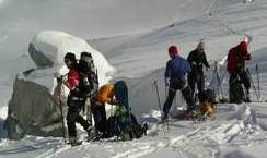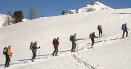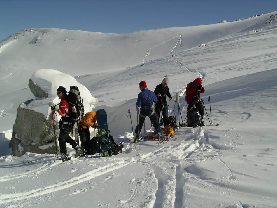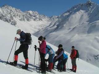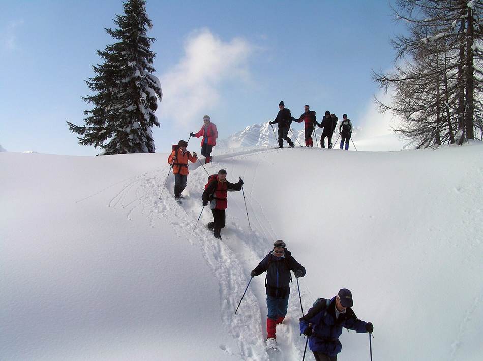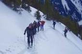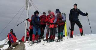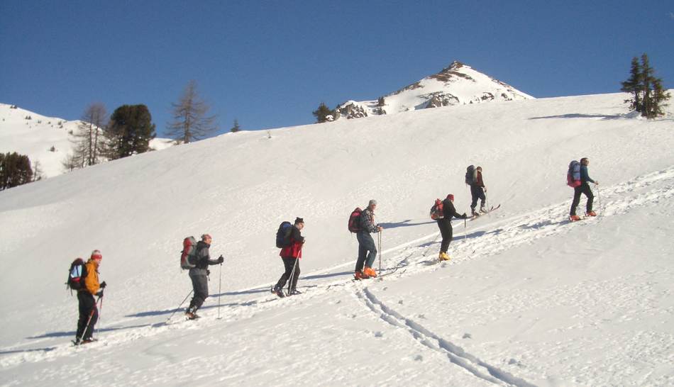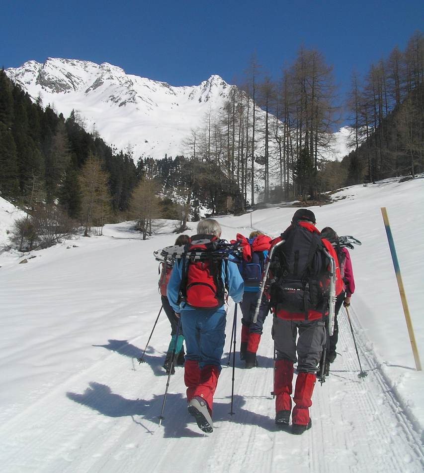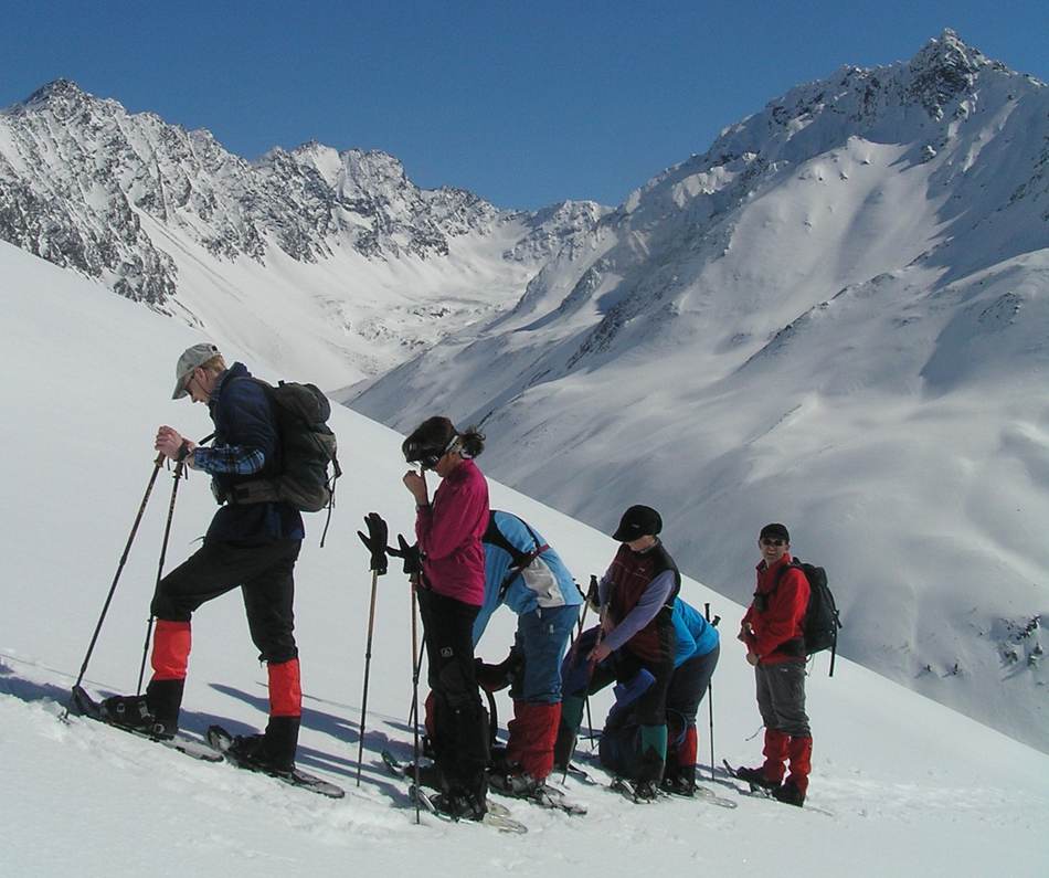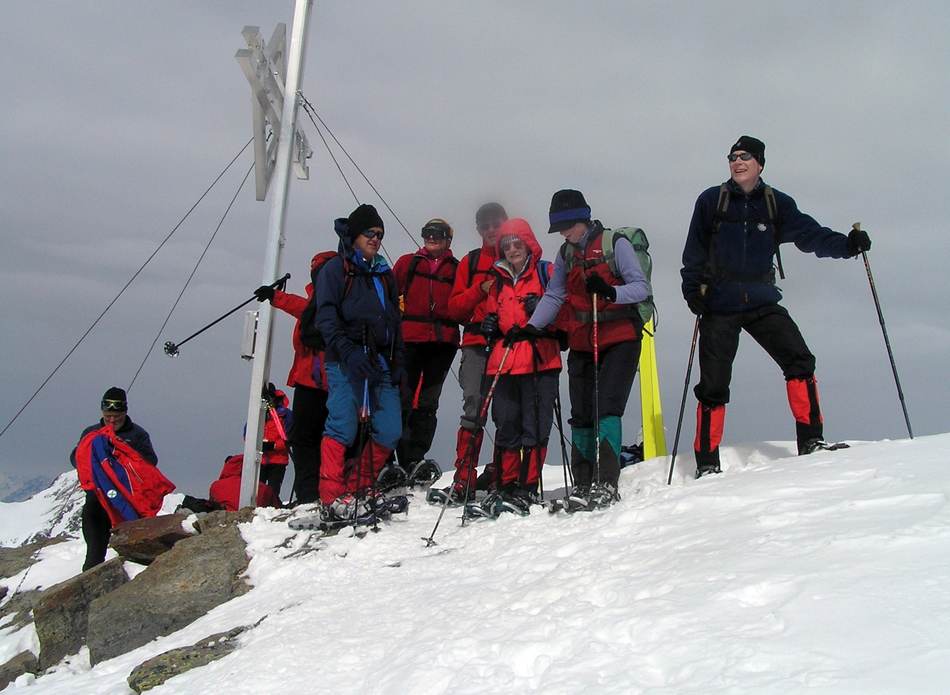 Leider war die geplante Cevedale-Tour aufgrund enormer Schneefälle und Lawinengefahr nicht möglich. Dass die Umstellung auf ein anderes Gebiet richtig war, zeigte ein Lawinenunfall am Cevedale genau auf unserer Route, bei dem es zwei Tote zu beklagen gab. Wieder ein Beweis, dass man den Gefahren des Winters richtig begegnen muss. Also fuhren wir für zwei Tage zur Guben-Schweinfurter-Hütte im Sellrain. In bestem Schneeschuhgelände erreichten wir die Hütte in zwei Stunden. Nach einer kurzen Stärkung lockte der herrliche Tag zu neuen Taten. Wir entschieden uns für den sehr steilen Anstieg auf den Vorgipfel (2 700 m ) des Finstertaler Fernerkogel. Durch wilde Latschenabschnitte und über steile Schneefelder erreichten wir diesen wunderschönen Aussichtspunkt. Den Abstieg nahmen wir auf der anderen Seite des Berges, so dass wir eine schöne Runde bis zu unserem angenehmen Nachtquartier zusammenbrachten. Am nächsten Morgen machten wir uns auf in Richtung Kraspesspitze. Zuerst galt es eine Steilstufe von dreihundert Höhenmetern zu überwinden. Wegen des harten Schnees kamen die Harschkrallen an unseren Schneeschuhen verstärkt zum Einsatz. Nach dieser etwas nervenaufreibenden Passage legte sich das Gelände zurück. Durch ein schönes Hochtal ging es in Richtung Gipfel. Dieser steilte sich zum Schluss noch etwas auf, machte aber keine Schwierigkeiten mehr. Blauer Himmel und ein herrlicher Blick über dem winterlichen Sellrain belohnten uns für den gut dreistündigen Anstieg. Beim Abstieg zogen wir an der Steilstufe unsere Schneeschuhe aus und stapften im nun weich gewordenen Schnee zur Hütte. Es war ein wunderschönes Zweitage-Erlebnis in einem für die meisten unbekannten Gebiet.