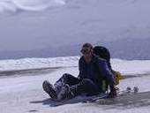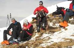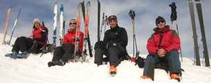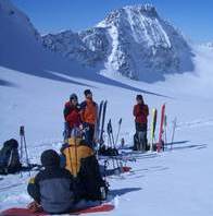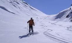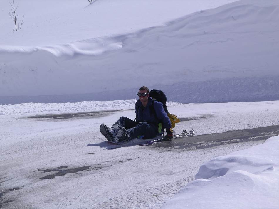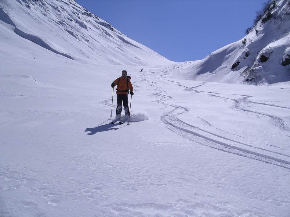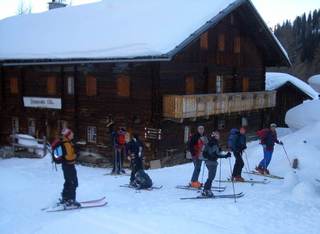 Der letzte Tag führte uns noch einmal zum Rauhen Kopf. Wolkenloser Himmel, angenehme Temperaturen und staubender Pulver: Diese Abfahrt war der skifahrerische Höhepunkt der Tour. Ein besonderes Schmankerl war der Slalom um die durch das Bieltal aufsteigenden Tourengeher. Mancher von ihnen hat wohl heute noch einen Schrecken von der wilden Horde auf Kollisionskurs! Von der Bielerhöhe aus entschieden wir uns gegen Tunneltaxi und Seilbahn für einen Abstieg der besonderen Art. Anfangs ging es auf den Schneeresten der Silvretta Hochalpenstraße bis zum Vermuntstausee. Glücklich, wer da nur zwei schmale Bretter hatte und keine Schaltafel. Das letzte Stück bot uns dann noch einige sehr schöne Hänge und eine abenteuerliche Routenführung durch Wald und über einige versteckte Sprungschanzen.