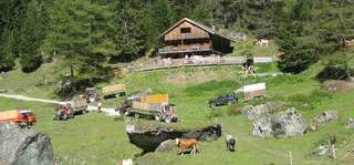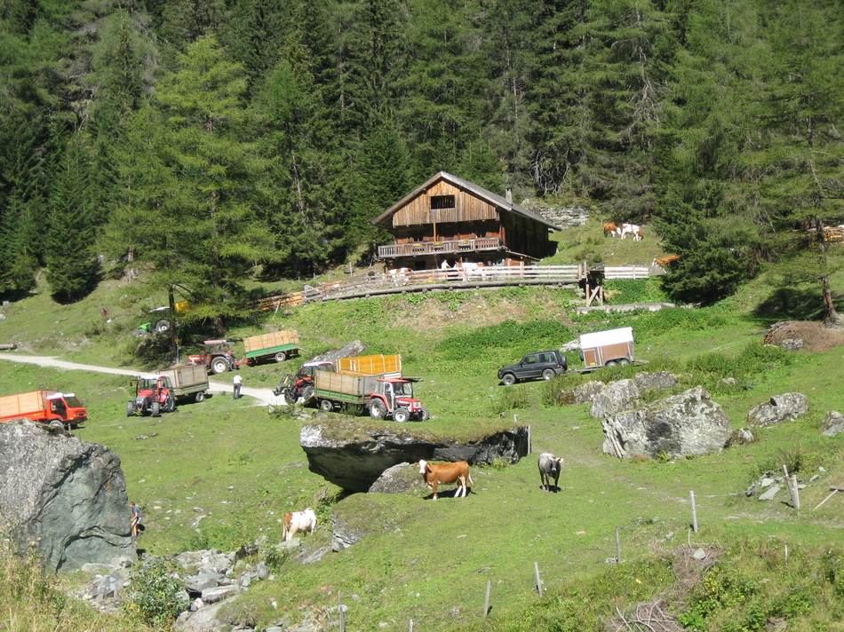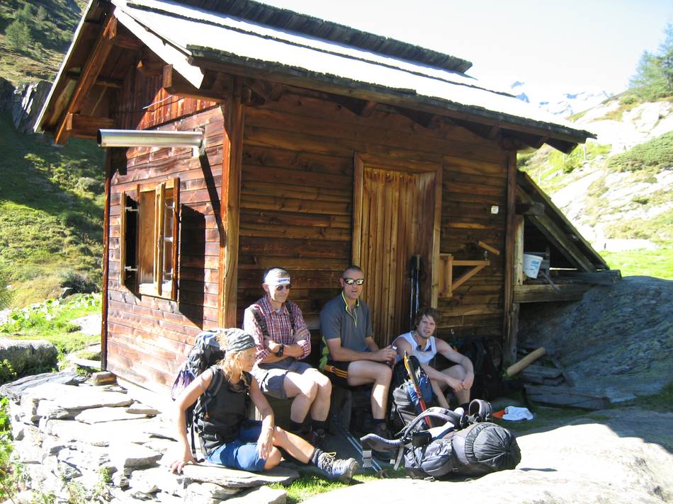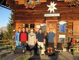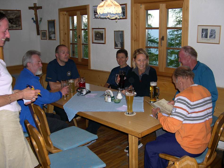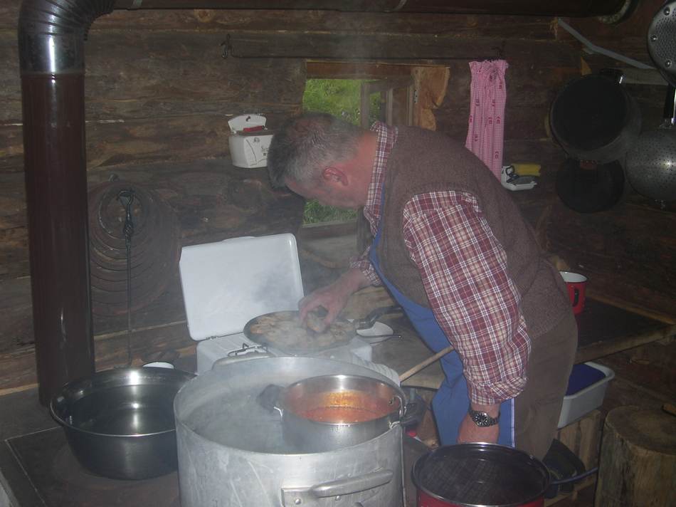 Für den 3. Tag war nämlich ein Tief angesagt. Deshalb ließ man sich gerne zu einer Jause in die hauseigene Almhütte einladen. Nach einem Marsch bei strömenden Regen wurden die durchnässten Alpini von Hermann dem Hüttenwirt in der wohlig warmen Stube empfangen. Den halben Nachmittag über verwöhnte er seine Gäste mit selbstgekochten Südtiroler Spezialitäten. Nur ungern verließen die Wanderer die gastliche Stube.
