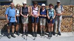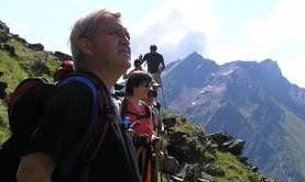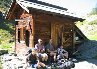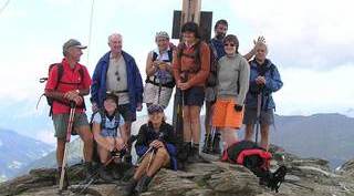 Über Nacht sind die 3000er eingezuckert worden. Trotzdem versuchten wir am 5. Tag die 3 097 m hohe Tuferspitze (ein Tipp vom Seniorwirt) niederzuringen. Vorbei an den Flatschbergalmen ging es über einen Felsensteig in 3½ Std. zum Flimjoch (2 850 m) . Ab hier lag Neuschnee. Die Gruppe musste sich ihren eigenen Weg zum Gipfel suchen. Dafür gehörte dieser dann den Eggenfeldenern ganz alleine. Eine herrliche Rundsicht auf Zufrittspitze und Cevedale im Nahbereich, sowie auf viele weißbedeckte Dolomitengipfel entschädigte für die Aufstiegsmühen. Es war Ehrensache einen kleinen Umweg in Kauf zu nehmen und der viel gepriesenen urigen Tuferalm einen Besuch abzustatten. Anstelle der Wirtin begrüßten uns nur die 3 alleingelassenen Hüttenschweine. Die erhofften Erfrischungen: Fehlanzeige! Trotzdem war Elmar von der Alm so begeistert, dass er kaum mehr von dort wegzubringen war und sich ernsthaft überlegt, im kommenden Sommer die freie Stelle des Senners anzunehmen.