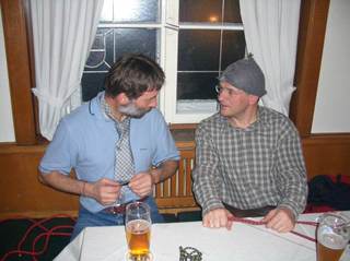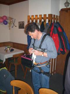 Knoten kann man bei uns nicht nur an der Kletteranlage erlernen, sondern auch im Wirtshaus, zumindest an diesem Abend. Mit Seilen, Seilstücken, Bandschlingen und Prusikschnüren erlernten wir die Handhabung der wichtigsten Knoten. Selbst wer dachte, dass er in dieser Materie fit sei, stieß mit dem doppelten Winsor-Knoten an seine Grenzen. Zum Ende des Abends, war jeder Teilnehmer in der Lage, mindestens das Klettersteigset (in gemeiner Ausführung, da dies im Gurt einzuknoten war) fachmännisch anzulegen. Für alle, die daheim üben wollen, gab es ein Foto-Skript mit den erforderlichen Seilverschlingungen der einzelnen Knoten. Wer darüber hinaus Interesse am Erlernen der Sicherungstechnik mit Seil und Karabiner hat, kann freitags gern an der Kletteranlage kommen.