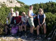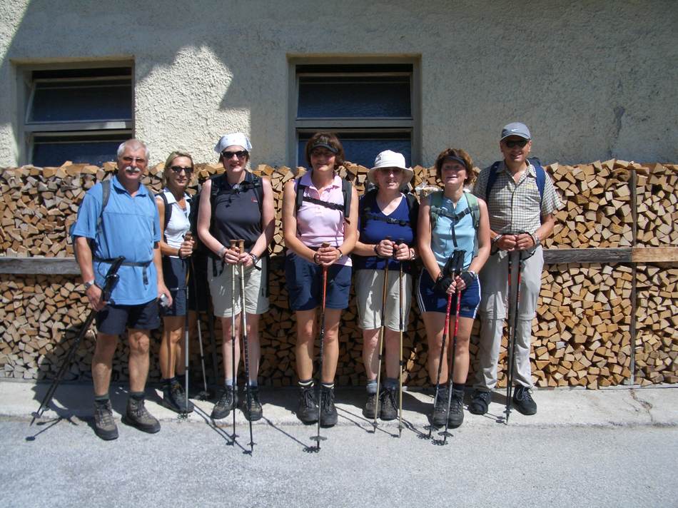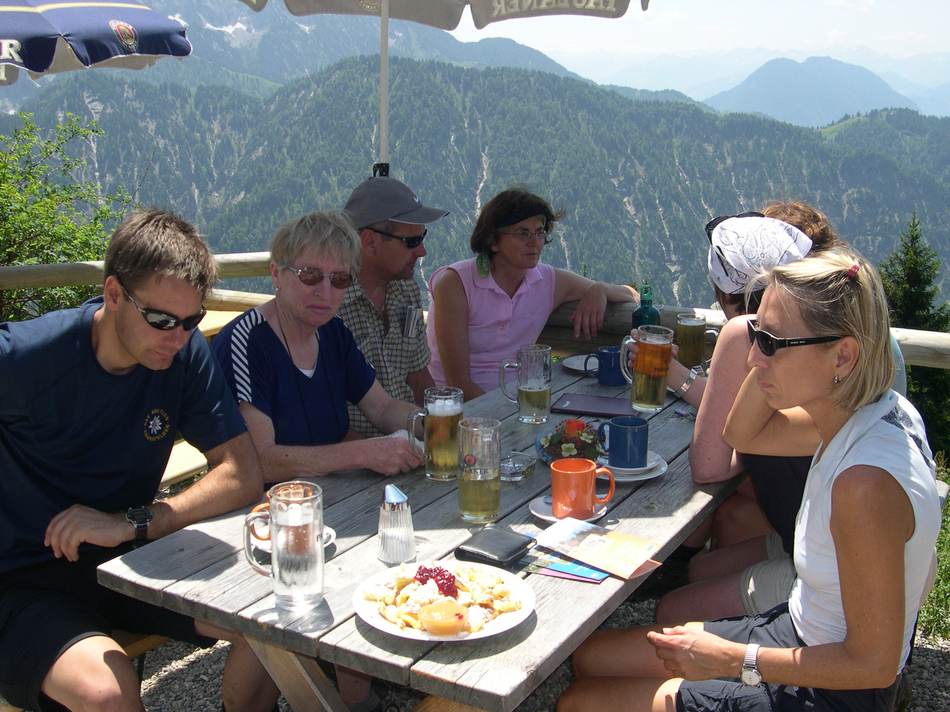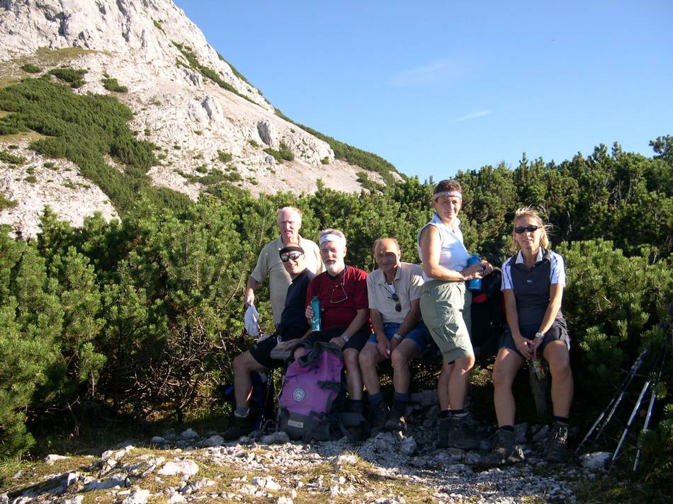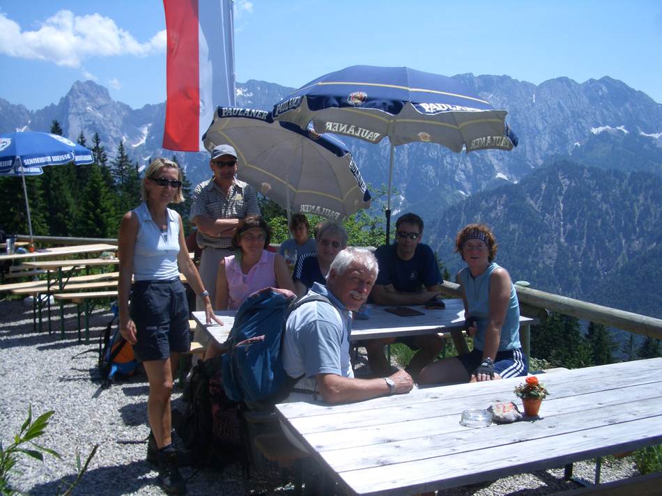 Der Große Rettenstein in den Kitzbühlern war uns für dieses Wochenende zu unsicher, und wir disponierten kurz entschlossen die Zwei-Tagesunternehmung um auf eine Tagestour. Die Traunsteiner Hütte auf der Reiter Alm sollte unser Ziel sein. Hierzu gingen wir über den Alpasteig von Reith aus los. Ein herrlicher Wanderweg durch Wald und Almgelände führt in ca. drei Stunden zur Hütte. Da es das Wetter (doch) zuließ, stiegen wir vorher noch auf den Weitschartenkopf (1 957 m) und konnten einen guten Rundblick genießen. Ein kühler Wind trieb uns hinab zur Hütte, wo wir uns Kuchen und Kaffee schmecken ließen. Beim Abstieg, den wir über den Schrecksattel wählten, konnten wir noch einigen „Vaterlandsverteidiger“ bei Übungen am Fels und im Gelände zusehen. Dies weckte in manchem Teilnehmer Erinnerungen an die eigene Militärzeit, die ja schon soooo lange zurück liegt. Insgesamt eine schöne Rundwanderung mit acht Stunden reiner Gehzeit, die von jedem Teilnehmer souverän gemeistert werden konnte.