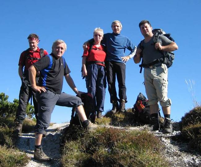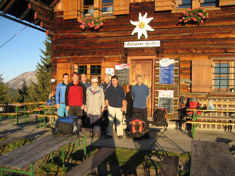 Auch im Jahr 2006 zeigte sich der Herbst pünktlich zu unserem Sommerabschied von seiner besten Seite. In den zwei Tagen wurden wir von der Sonne regelrecht verwöhnt. Eine kleine, mit Berücksichtigung der Mountainbiker waren wir sogar zwei kleine Gruppen, meldeten sich zur Tour an. Die Berggeher, inkl. einer weiblichen Begleitung, entschieden sich entgegengesetzt zur ausgeschriebenen Route, für den längeren Aufstiegsweg. Über einen sehr reizvollen Steig, welcher uns über die Jochwand führte, kamen wir fast im Halbstundentakt an etlichen Wegweisern mit der Aufschrift „Goiserer Hütte 2½ Stunden“ vorbei. Als Tourenleiter kommt man hier schon mal in Erklärungsnot! Letztendlich sahen wir nach einer Gehzeit von gut vier Stunden endlich unsere Hütte. Das von den Tagesgästen belagerte Hütteninnere zwang uns förmlich zu einem sofortigen Gipfelanstieg des Hoch Kalmbergs (1 833 m ). Bloß gut, dass wir beim Aufstieg an einer Höhle vorbei kamen, ansonsten hätten wir die angegebene Aufstiegszeit von einer Stunde, dank Gertis Spurteinlage weit, weit unterschritten. An der Hütte wieder angekommen, sollte der gemütliche Teil des Sommerabschieds folgen. Nach dem Eintreffen unserer Mountainbiker und diversen anderen Gruppen, kam zur fortgeschrittenen Stunde Geselligkeit auf. Lag dies am „Leberwurst-Schnaps“? Nach einer beengten Nacht im Lager, ein schnarchender sowie sich breitender Egoist war hierfür verantwortlich, und einer Nase voll Plums-Klo-Gerüchen, begrüßten wir den nächsten Tag. Schon während des Frühstücks offenbarte sich ein blauer Himmel mit strahlendem Sonnenschein. Schnell noch einen Tee ohne Tee beim Wirt bestellt (gemeint wurde Teewasser) und schon ging es in Richtung Großer Brettkogel (1 658 m ) . Ein Teil dieser Wegstrecke übte so eine große Anziehungskraft auf uns aus, dass wir diese zweimal absolvierten. Ohne weitere Umwege, dafür aber durch ein markiertes wegloses Gelände, kamen wir nach viereinhalb Stunden am Gipfel an. Hier offenbarte sich uns eine faszinierende Weitsicht bis hin zu den Zillertaler Alpen. Als Abstieg wählten wir den Weg über die Knallalm. Nach einem dreieinhalbstündigen strammen Marsch kamen wir an unserem Ausgangspunkt müde aber glücklich an.