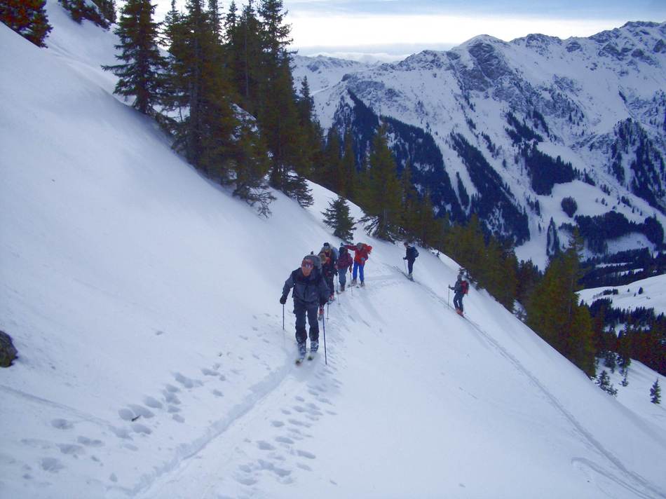 Wie diese Unternehmung zu der Ehre gelangt ist, als „Schwere Skitour“ im Programm zu rangieren, entzieht sich der Kenntnis des Tourenleiters. Es hatte jedenfalls den Effekt, dass sich nur eine Handvoll Wagemutiger den Herausforderungen stellen wollte. Und weil es die angekündigten Wetter- und Schneeverhältnisse vorteilhaft erscheinen ließen, wurde die Tour kurzerhand ins Karwendel verlegt. Positiver Nebeneffekt: Das Karwendel liegt aus Tourenleitersicht quasi im eigenen Garten. Die übrigen Teilnehmer nahmen die lange Anreise mehr oder weniger klaglos in Kauf und kamen dafür in den Genuss zweier ausgezeichneter Skitage bei ausgesprochen guten Verhältnissen. Wegen des eigentlich schlechten Wetters hatten wir den Scharfreuther, den absoluten Modeberg im Karwendel, der ansonsten von Skitourengehern geradezu heimgesucht wird, fast für uns allein. Darüber hinaus auch noch in ausgiebigem Sonnenschein. Der eine oder andere Teilnehmer, der völlig übermüdet angetreten ist, konnte diese außerordentliche Situation natürlich nicht angemessen würdigen und war nur froh, die Abfahrt im nicht mehr ganz lockeren, aber größtenteils unverspurten Pulverschnee hinter sich zu bringen. Das nachmittägliche Schlechtwetter mit ergiebigem Regen konnten wir in unserem Talquartier, dem Gasthof Post in Vorderriß, bei Apfelstrudel und Kaiserschmarrn gut aussitzen. Weil aber im Karwendel ein ganzer Haufen Schnee liegt, hat der Regen der Schneedecke nicht über die Maßen zugesetzt. Am nächsten Morgen erwartet uns ein wolkenloser Himmel und wir nehmen den Anstieg zur Torscharte unter die Felle. Wiederum finden sich nur noch zwei weitere Tourengeher oben ein und wir genießen die Abfahrt durch unverspurten Pulver. Erst an der Rappenklammspitze, dem zweiten Tagesziel, häufen sich andere Skitourengeher und schlechterer Schnee. Durch die südseitige Lage weichte die Schneedecke ziemlich auf und die vielfach grund-lose morsche Konsistenz erforderte beherztes Agieren. Dieser eindringliche Rat seitens des Tourenleiters wurde jedoch nicht von allen Teilnehmern mit dem erforderlichen Nachdruck umgesetzt. Dann halt beim nächsten Mal.