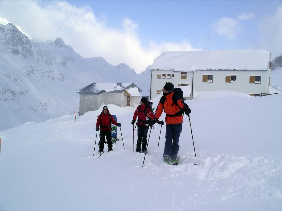 Der Start in diese Tage war alles andere als angenehm: Keine Sicht und leichter Schneefall ließen uns am ersten Tag direkt von der Bielerhöhe zur Wiesbadener Hütte aufsteigen. Den „Rauhen Kopf“ ließen wir links liegen. Trotzdem waren am Nachmittag doch noch einige bereit, eine Bewegungs- und Einschwingtour auf eine namenlose Scharte zwischen Vermunt- und Ochsenkopf anzugehen. Hier zeigten sich bereits die schlechten Gleiteigenschaften des Schnees, was aber der Freude am Pulver zumindest zeitweise keinen Abbruch tat.