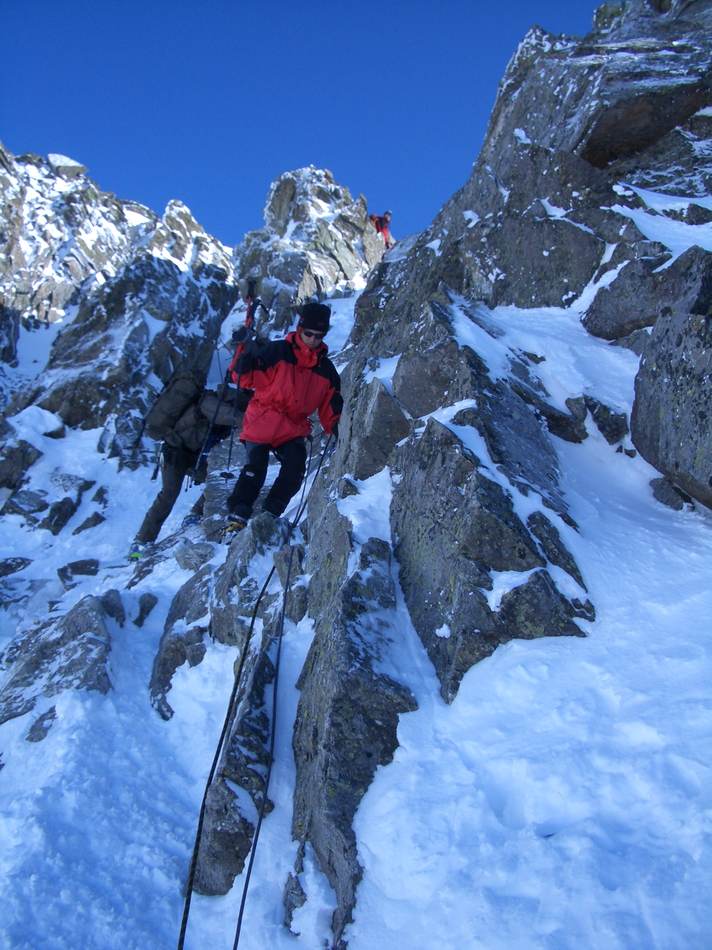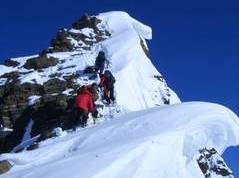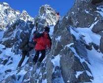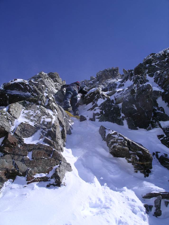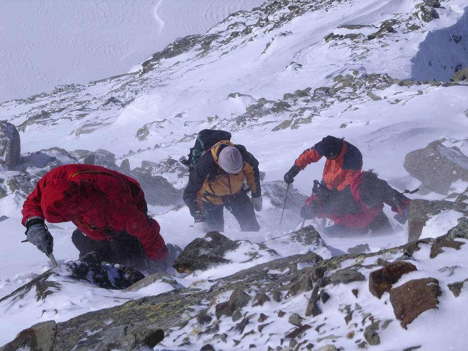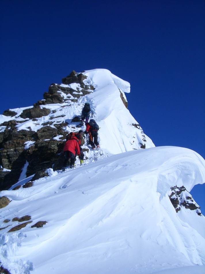 Einige ganz besondere Schmankerl kamen an diesem Wochenende zusammen: ein toller Winterraum, eine unerwartete Rotwein-Inflation, Schneeschuhe und eine Eiswand nur für uns! Doch von vorn: Angefangen hat es damit, dass einer so spät in Vent ankam, dass alle nass wurden! Das Gewitter focht uns aber nicht an, hatten wir doch Rückhalt vom Gabl Charly aus Innsbruck: Morgen sollte es bestes Wetter geben! Der frühe Aufbruch half alles nichts, der Schnee verlangte nach Schneeschuhen. Mit deren Hilfe hatten wir aber bis zum Mitterkarjoch relativ leichtes Spiel. Auf der Nordseite ließen wir die Wildspitze rechts liegen und stapften zum Einstieg hinüber. Auf zwei Seillängen Firngestapfe folgten zwei kernige Blankeislängen, bei denen Eisbeile und Eisschrauben gefragt waren und wieder ein firniger Gipfelausstieg. Punkt 12 Uhr waren beide Seilschaften dann auf dem Gipfel vereint. Alpin ging es über den Ostgrat zum Schneeschuhlager am Joch zurück. Von nun an ging es abwärts!