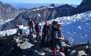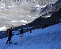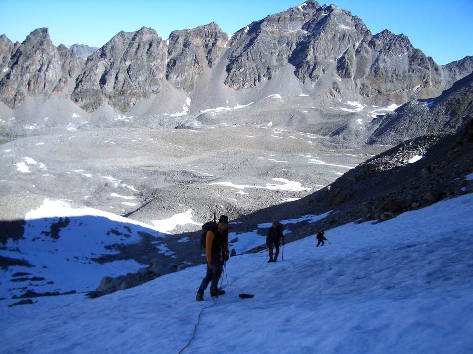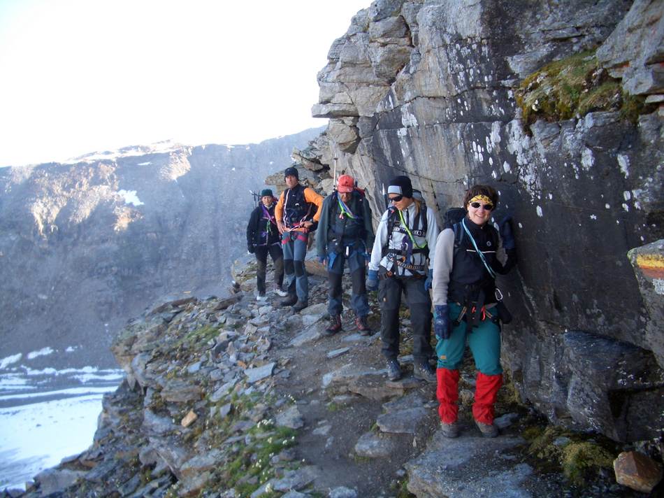 Ein besonderes Hochtouren-Schmakerl sollten wir an diesem verlängerten Wochenende kennen lernen. Von Sulden aus begannen wir um die Mittagszeit den Anstieg zur Düsseldorfer Hütte (2 721 m) . Bei Traumwetter kamen wir ordentlich ins Schwitzen. Die Strapazen waren auf der Hüttenterrasse bei Kaffee und Rotwein, mit Blick auf Ortler, Zebru und Königsspitze schnell vergessen. Auch auf die Fußball-WM-Ergebnisse brauchten wir Dank einer Handy-Live-Schaltung ins Wohnzimmer der Familie Zelger nicht verzichten. Mit dem Erfolg der deutschen Fußballelf gegen Argentinien konnten wir am nächsten Tag optimistisch unseren ersten Gipfel, die Vertainspitze, in Angriff nehmen. Über einen letzten Gletscherrest erreichten wir die Angelusscharte.