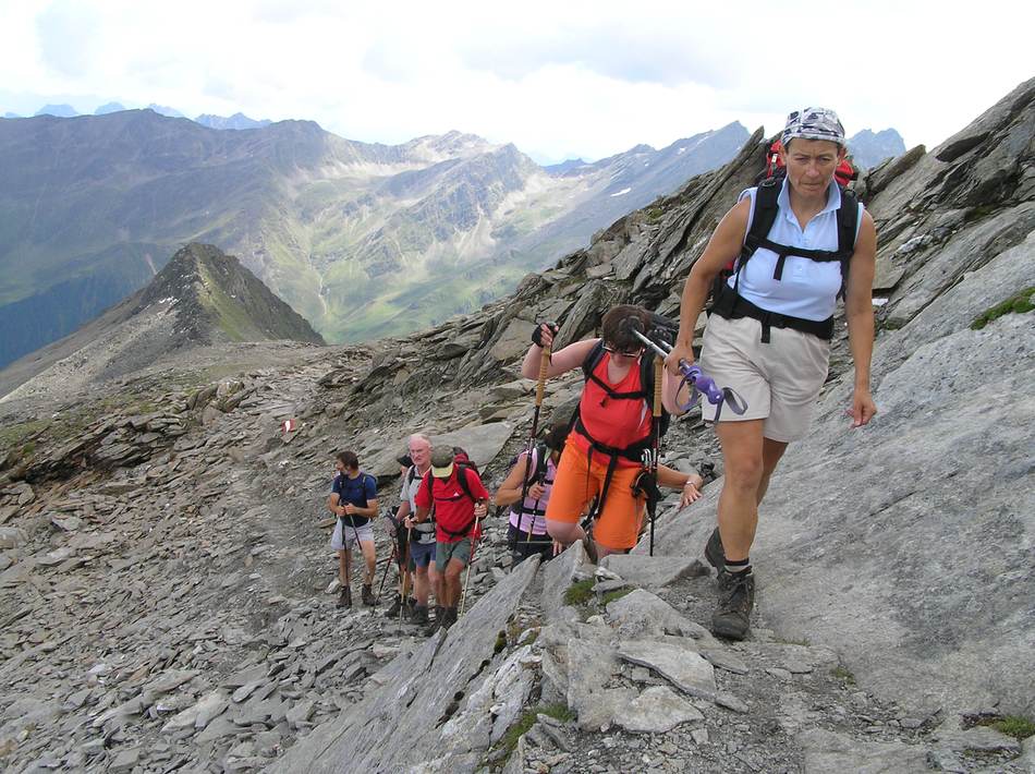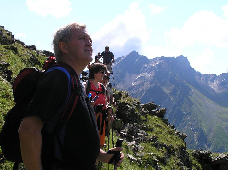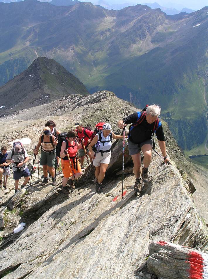 Dass die Berge im Sellrain im Winter einiges zu bieten haben, hatten wir schon bei unserer Schneeschuhtour zur Kraspesspitze erfahren. Doch auch im Sommer haben diese Berge ihren Reiz – gerade für Wanderer. Bereits um 5:00 Uhr starteten wir von Eggenfelden nach Praxmar, unserem Ausgangspunkt. Herrliche Blicke zum Lüsenser Fernerkogel, einem berühmten Skitourenberg, begleiteten uns beim Anstieg zum Zischgeles. Kurz unter dem Ziel führte uns der markierte Wanderweg in die Felsen des Gipfelgrates, die immer wieder die Zuhilfenahme der Hände forderten. Doch jeder meisterte diese Herausforderung problemlos. Das Panorama reichte von den vergletscherten Stubaier Gipfeln bis zur Zugspitze und ins Karwendel. Den Abstieg wählten wir über das Sattelloch, so dass wir eine vollständige Überschreitung diesen schönen Gipfels einheimsen konnten. Ein paar Regentropfen taten der guten Stimmung keinen Abbruch. Auf der nun wieder sonnigen Sonnenterasse des Alpengasthofes Praxmar genehmigten wir uns einen Kaffee, bzw. eine frische Halbe Bier, bevor wir unser Quartier, den Berggasthof Lüsens aufsuchten. Hier konnten wir unsere Akkus in aller Ruhe mit fester und flüssiger Nahrung auffüllen. Nachdem der Dauerregen der Nacht bis zum nächsten Morgen aufgehört hatte, machten wir uns frohen Mutes an die Besteigung des Roten Kogels. In schönem, aber teilweise steilem Wandergelände erreichten wir diesen Aussichtspunkt. Hinsichtlich Aussicht war allerdings nicht viel geboten. Leider machte sich die angekündigte Wetterverschlechterung mit Wolken und einigen Regentropfen bemerkbar. Also ging es auf dem Anstiegsweg flugs zurück zu unseren Fahrzeugen. Nach einer kurzen Einkehr in Gries fuhren wir zufrieden wieder nach Eggenfelden. Eine schöne Wochenendtour für landschaftsbegeisterte Bergsteiger.