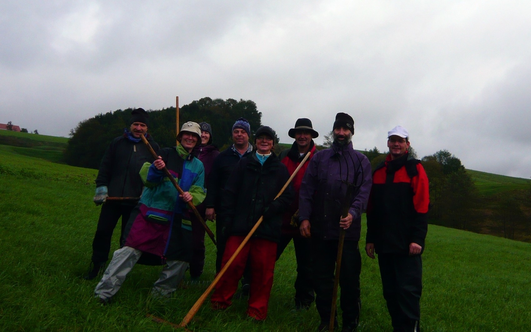Bei noch sonnigem Wetter erklärten sich 3 Rentner und eine tapfere Frau bereit, die gesamten Mäharbeiten am Biotop zu übernehmen. Aufgrund der guten Wuchsbedingungen in diesem Jahr stand das Gras und Gestrüpp teilweise mannshoch. Vier Stunden wurde mit einem Balkenmäher und drei Motorsensen gemäht. Gut 14 Tage später – bei „Brietsch-Wetter“ konnte ich nur sieben Mitstreiter finden, die diese schwere Arbeit (mehr oder weniger) freiwillig mitmachen wollten. Ca. 48 cbm Grüngut mussten zusammen gerecht und aus der Pflegefläche abtransportiert werden. Dieses Mal versuchten wir es mit großen, festen Plastiksäcken die wir befüllten und zu Zweit über den Boden schleiften. Diese Idee (die beim Sommerabschied geboren wurde) stellte sich als genial heraus. Trotzdem war die Sache noch sehr kraftraubend. Gut dass uns die Deimel-Bäuerin wieder zur Stärkung bei sich aufnahm. Bei Mittagessen und anschl. Kaffee und Kuchen waren wir stolz, auch dieses Jahr diese Arbeiten wieder erledigt zu haben. Ein Dank an Alle! Der verdiente Geldbeitrag von einigen hundert Euro wurde von den Helfern dem Verein gespendet. Herzlichen Dank.