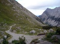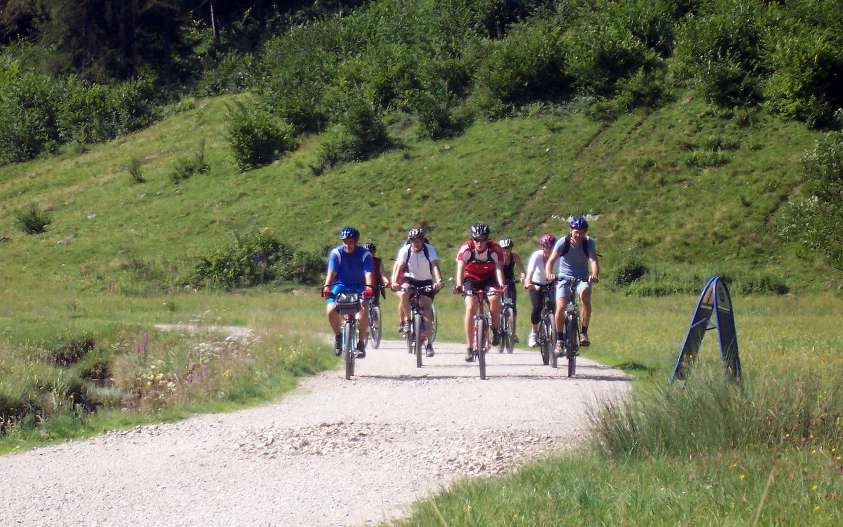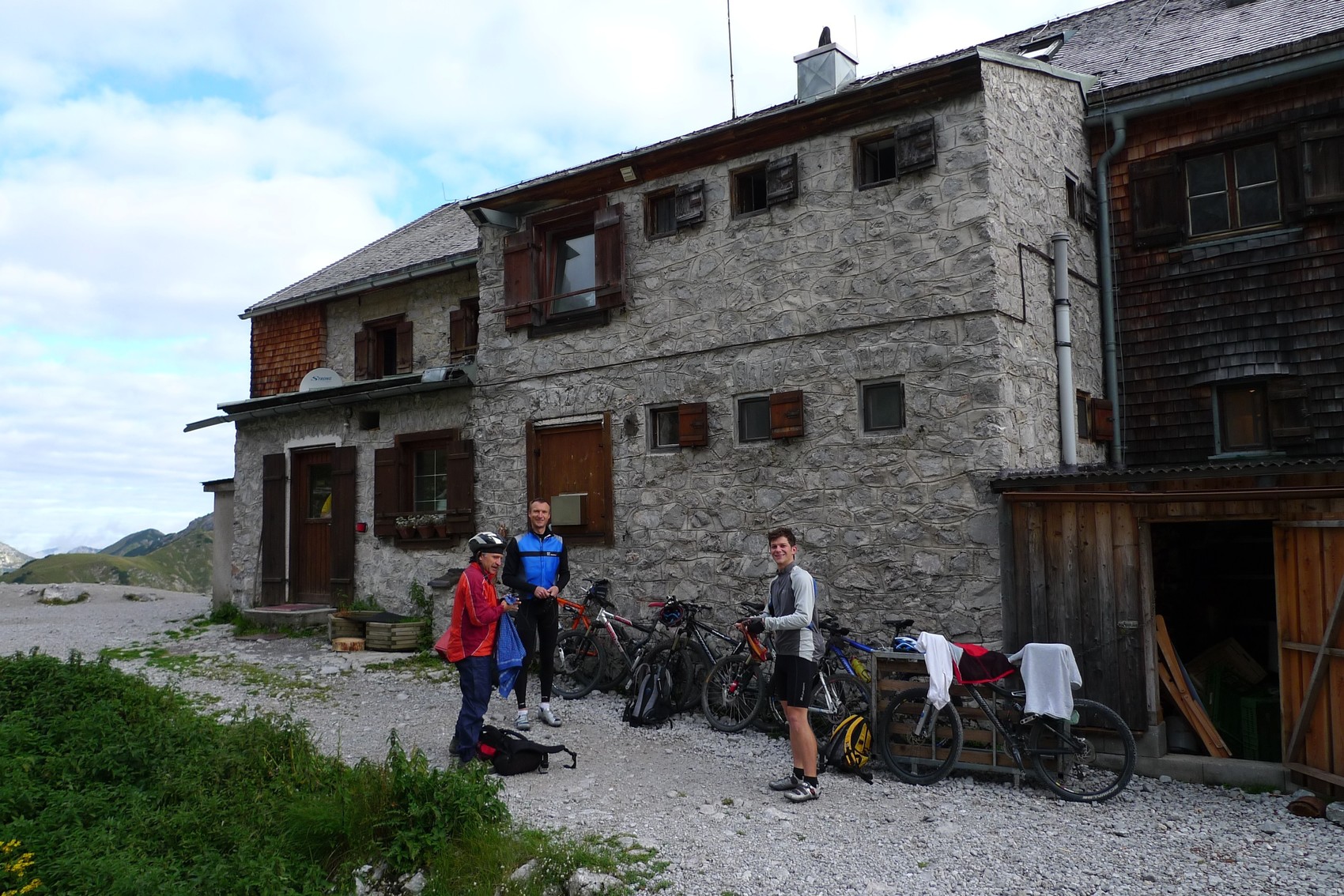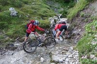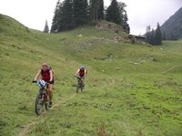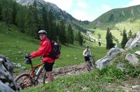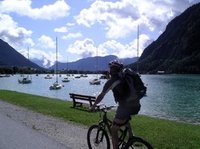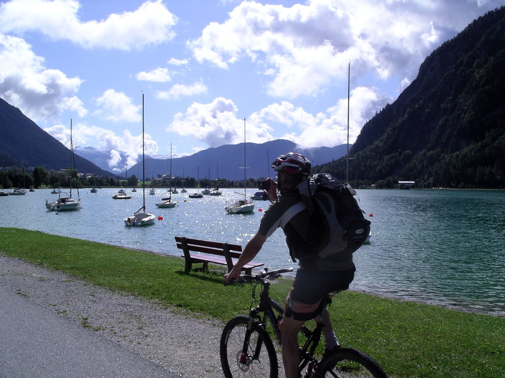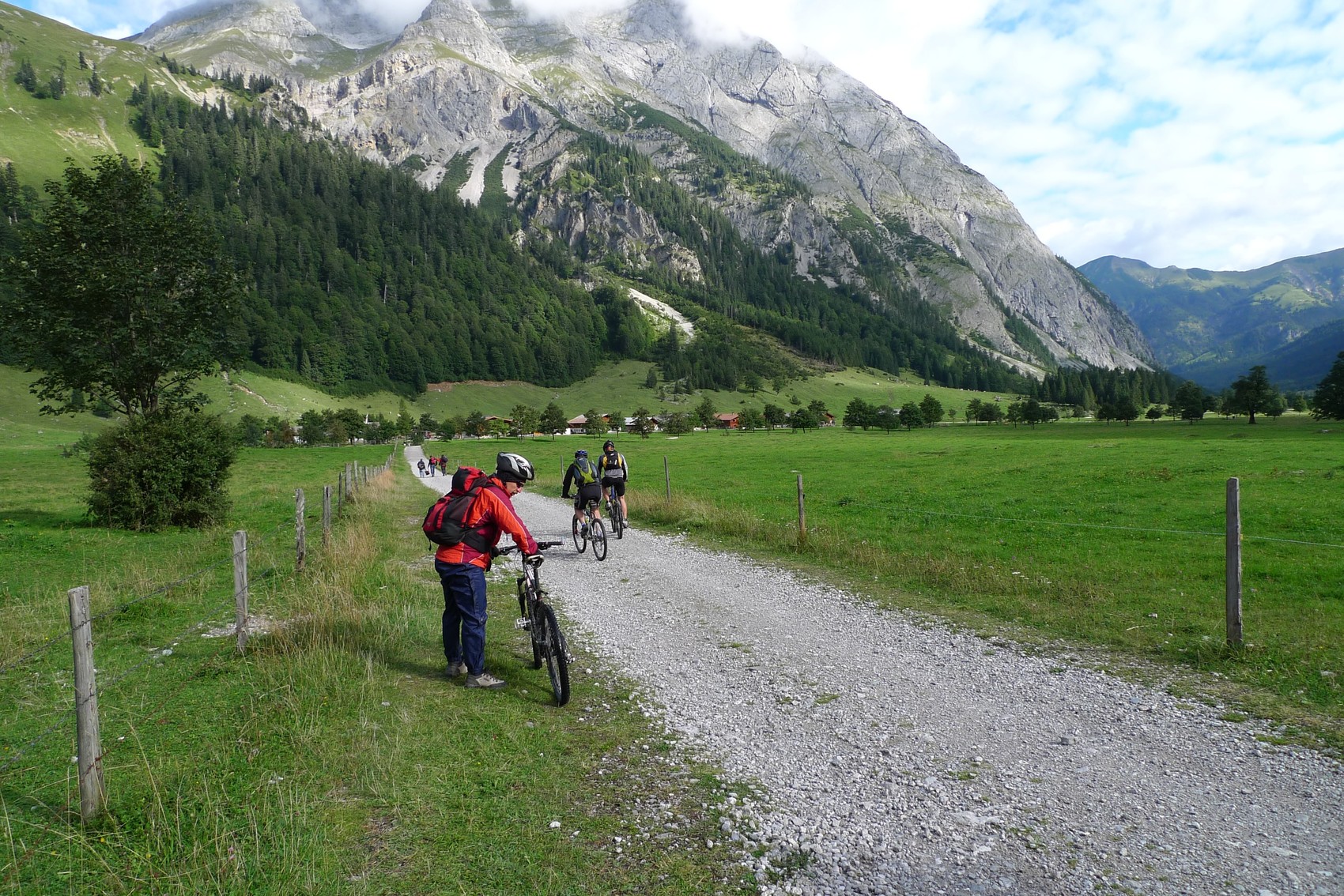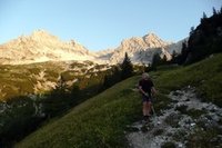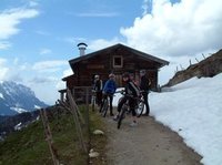 Am späten Vormittag trafen wir uns nach längerer Anreise am nördlichen Ende des Achensees. Von hier aus starteten wir unsere zwei-Tages-Tour durchs östliche Karwendel. Auf den ersten zehn flachen Kilometern entlang des Achensees konnten wir uns gemütlich warmfahren. Für den ersten kurzen Anstieg von kaum 100 Hm hinauf zur Rodelhütte fast schon zuviel. Von hier aus bis nach Jenbach im Inntal ging es über 400 Hm bis auf 540 m nur bergab. Daran, dass die Lamsenjochhütte, unser Tagesziel, auf 1953 m liegt, dachte man besser nicht, sonst hätte man glatt den Spaß am Bergabfahren verloren. Die nächsten 10 km führten übers Schloss Tratzberg in abwechslungsreicher Fahrt nach Stans und durch die Wolfsschlucht nach St. Georgenberg. Bis ins Stallental ging’s nochmals 100 Hm hinab. Mussten wir bis hierher gelegentlich einen Blick in die Karte zur Orientierung werfen, so war es nun umso klarer: immer Richtung Lamsenjoch, ein Weg, nur noch bergauf bis zur Hütte, nicht unter 10% und lange Strecken über 20%. Nach einer kurzen Brotzeit – der erste konnte es nicht mehr abwarten und radelte noch mit der halben Wurstsemmel im Mund schon los – gingen wir den letzten Abschnitt an. Eigentlich angefahren, gegangen sind wir dann später, bei knappen 30% Steigung und tiefem Schotter. Das Wetter war mittlerweile richtig frisch geworden, es blies ständig ein leichter aber kalter Wind; und nur deshalb waren wir froh, als wir am späten Nachmittag bei der Lamsenjochhütte ankamen, mit einem Mordshunger. Selten werden fünf Suppen vor dem eigentlichen Abendessen bestellt. Nur von Zweien! Der Rest hielt sich mehr an Kaffee und Kuchen. Nach einem guten Frühstück – das schweizer Müsli muss man vielleicht mögen – machten wir uns auf den Weg. Bis zum westlichen Lamsenjoch fährt und schiebt man auf anspruchsvollem Pfad, teils absturzgefährdet unter den Felsabbrüchen der Lamsenspitze. Die folgende Etappe, 850 Hm an den Engalmen vorbei, bis hinab zum Großen Ahornboden ist wohl einer der landschaftlichen Highlights der Tour. Nach ein paar Kilometern auf Asphalt hielten wir uns Richtung Plumsjoch, dem höchsten Punkt dieses Tages. Der Anstieg, nie steiler als 8–9 %, mit festem Schotter und gleichmäßiger Steigung war ein regelrechter Genuss. Und wir hätten ihn noch viel mehr genossen, hätten wir die noch kommenden Anstiege schon gekannt. Doch zunächst konnte sich jeder nach Herzenslust bei der ziemlich groben und steilen (bis 30 %) Abfahrt ins Gerntal austoben. Das folgende kurze Flachstück war zum Erholen und zum in-die-Landschaft-schauen fast zu kurz. Denn schon war linker Hand der Schleimssattel angeschrieben, der seit ein paar Jahren über eine Forststraße zu erreichen ist. Und obwohl der Weg für Fahrräder gesperrt war, wollten diese partout nicht zurückbleiben. Bei einer kleinen Brotzeit auf dem Schleimssattel war Zeit für einen Blick in die Karte. Es ging hinab zur Mantschenalm. Beim Anblick der Kollegen, die grad von dort heraufkamen, lag die Vermutung nahe, es müsste besser Matsch(en)alm heißen. Aber es geht noch schlimmer als man es sich vorstellt. Einen Almweg so mit Erde, Letten und Humus herzurichten, dass man bei ordentlichem Gefälle noch Treten muss, um nicht bis zum Tretlager stecken zubleiben, das muss man erstmal schaffen. Da macht doch glatt das Radverbot wieder Sinn; aber Gummistiefel hätten wir auch nicht dabei gehabt. Bei der Mantschenalm war’s geschafft und der weitere Weg auf felsigem Pfad war richtig zum Genießen. Trials muss man allerdings mögen, was bei allen Teilnehmern der Fall war. Sogar ein Gumpen zum Radwaschen war vorhanden. Nach kurzweiliger Abfahrt mündete der Pfad auf eine Forststraße, die uns nach 660 Hm Abfahrt, durch enge Bachtäler und eindrucksvolle Kulissen ins Bächental brachte. Dort vereinigen sich Baumgarten-, Eiskönigin-, Plums-, Schleims-, Tannauer-, und Tiefenbach zur Dürrach, die in den nördlich gelegenen Sylvensteinsee mündet. Unser Ziel war allerdings der Achensee im Osten, nicht unbedingt weiter weg, aber ein paar Berge lagen dazwischen. Auf die wollten wir nicht, der Sattel zwischen Demeljoch und Juifen auf 1530 m war allerdings auch nochmals über 600 Hm weit weg. Aber auch der letzte Anstieg war zu schaffen und auf der Hochleger-Alm gönnten wir uns eine Rast bei guter Brotzeit und alkoholfreiem Bier. Lieber auf den Alkohol verzichtet als auf eine Spitzkehre in der Abfahrt. Es war schon Nachmittag, 15 km waren noch zu fahren, also machten wir uns auf den Weg hinab ins Achental. Kurz vor Achenwald mündete die Forststraße in die Achental-Bundesstraße, die brettleben nach Achenkirch und damit zurück zum Ausgangspunkt führt. Nur nicht für Radfahrer, die dürfen noch manchen giftigen Anstieg mitnehmen. Aber nach 3700 Hm und 120 km durchs Karwendel kommt’s auch nicht mehr drauf an.