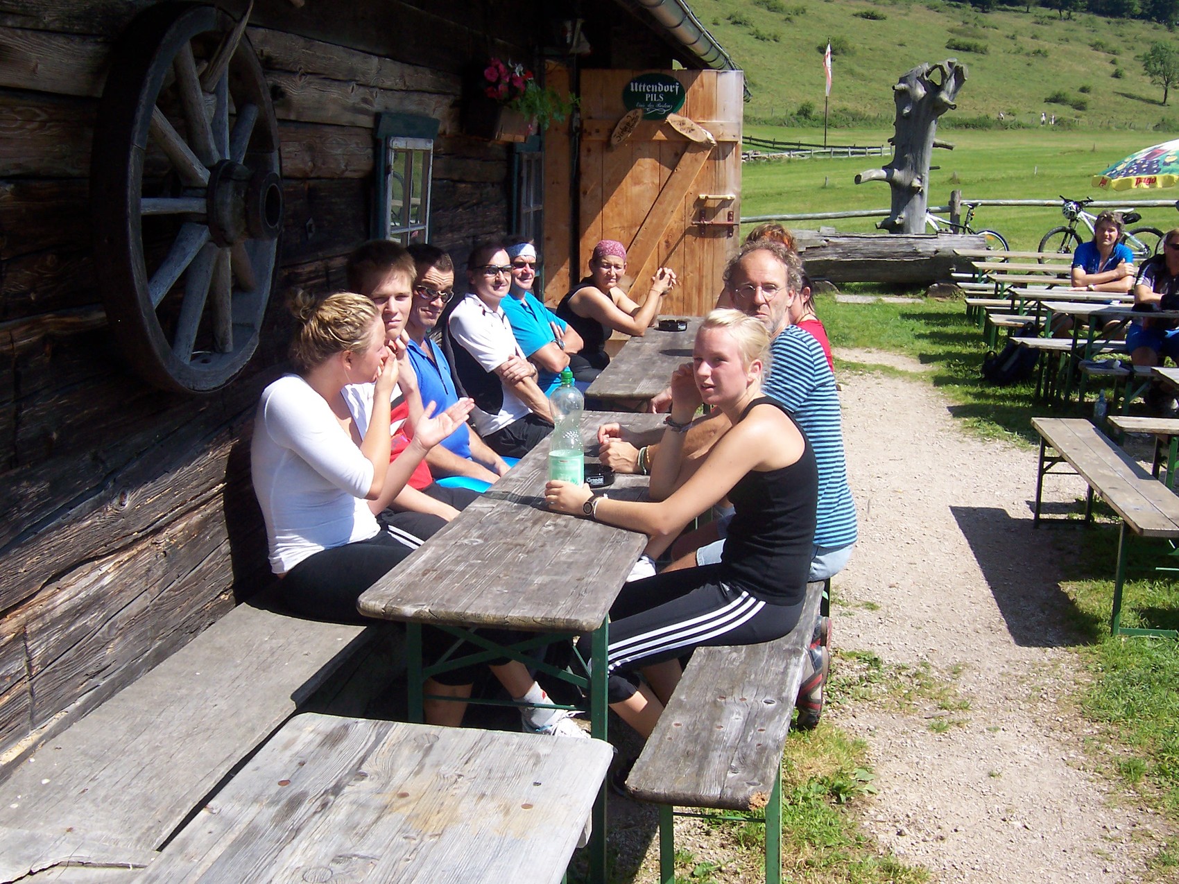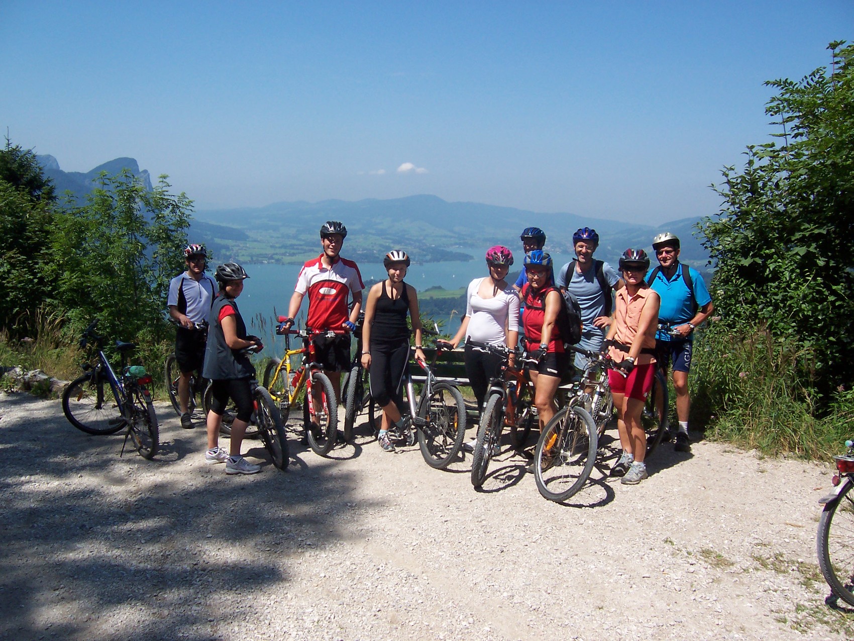 Von Burgau am Attersee über die Forstraße, mit einem Abstecher um den Schwarzensee und einer kurzen Rast beim Aussichtspunkt oberhalb der Burggrabenklamm mit herrlichem Blick auf den Attersee erreichten wir die Eisenauer Alm. Dort stärkten wir uns bei einer kräftigen Brotzeit frisch gebackenen Brot und Most für die Abfahrt. Diese begann gleich mit einem Steilstück das wir die Fahrräder schiebend überwanden. Nun ging es rasant die Forstrasse nach Scharfling hinunter, immer mal wieder den Mondsee im Blick. Unten angekommen machte noch eine Vierer-Gruppe einen Sprint auf die Scharflinger Höhe. Der Rest der Gruppe radelte gemütlich durch den Wald und der Seeache entlang zurück nach Burgau am Attersee. Nach einer kurzen Abkühlung im See fuhren wir mit dem Vereinsbus wieder nach Hause.