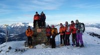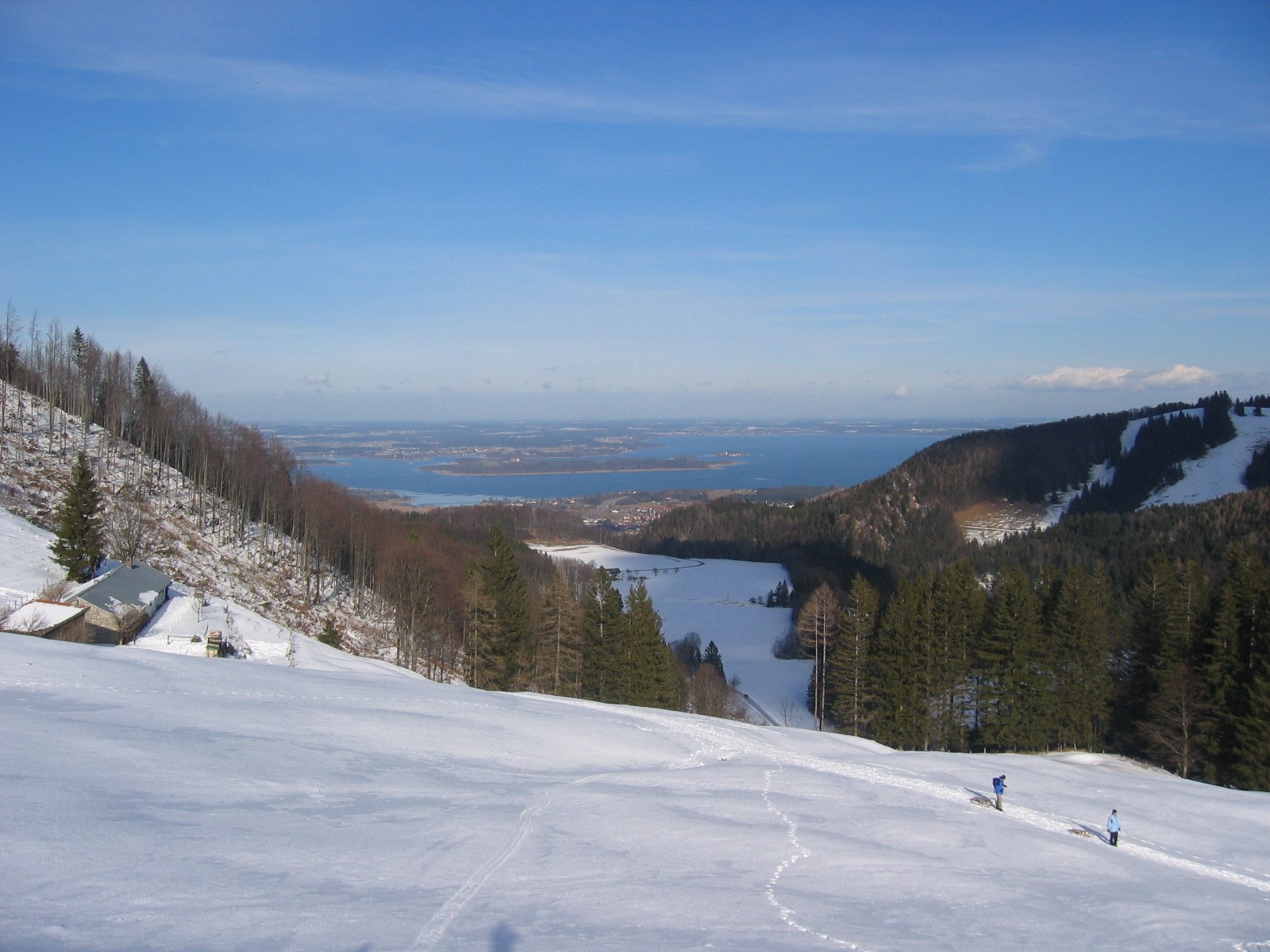 Als geradezu ideal erwies sich die kleine Chiemgauer Runde als Auftaktschneeschuhwanderung. Bereits am Ausgangspunkt war die Schneelage ausreichend, so dass die Schneeschuhe gleich zum Einsatz kamen. Nach dem obligatorischen Piepsertest hielt uns nichts mehr. Vorbei an der Vockalm ging es einsam zum Schwarzenberg. Sehr gut war von hier der weitere Weg zum Erlbergkopf und dem Haindorfer Berg, der dritte Gipfel, zu sehen. Problemlos bewältigte die Mannschaft den Anstieg und genoss die mitgebrachte Gipfelbrotzeit. Gemütlich ging es weiter, bevor wir zum letzten Gipfelsturm ansetzten. Da sich die Wolken immer mehr verzogen, konnten wir bei der wärmenden Wintersonne die schöne Aussicht auf den Chiemsee und die Kampenwand genießen. Der Blick zurück auf Schwarzenberg und Erlbergkopf, mit den jeweiligen Anstiegen, zeigte noch mal den Reiz der Runde.