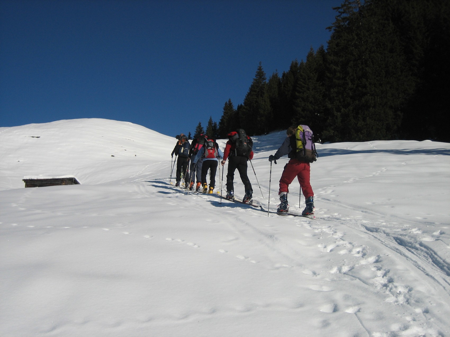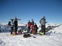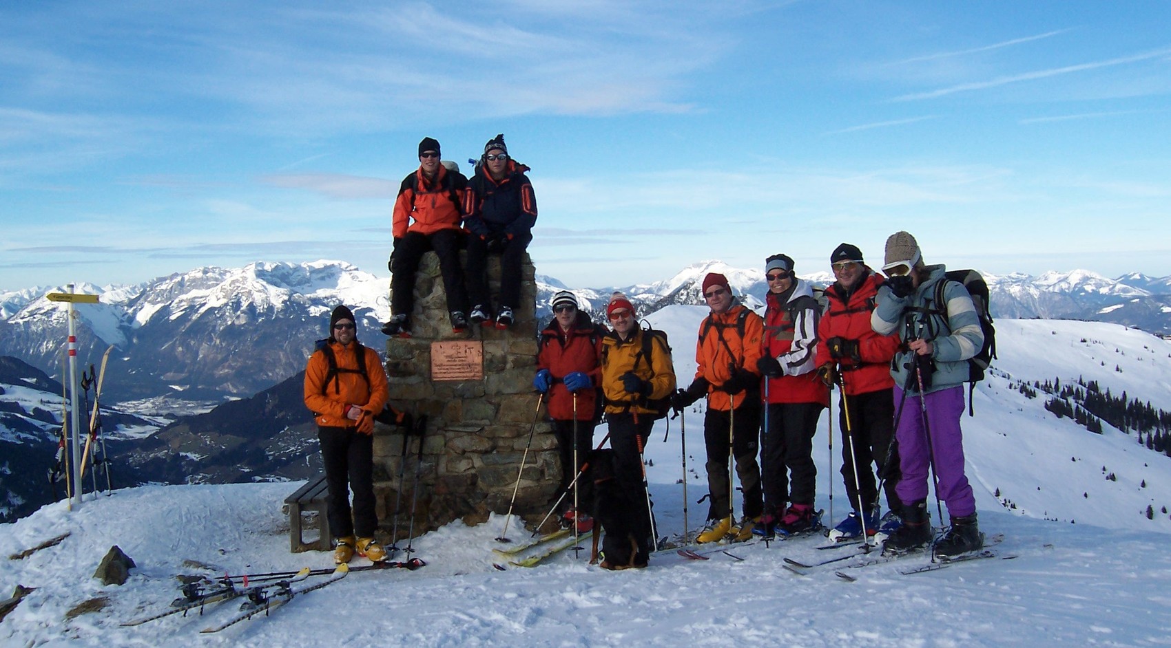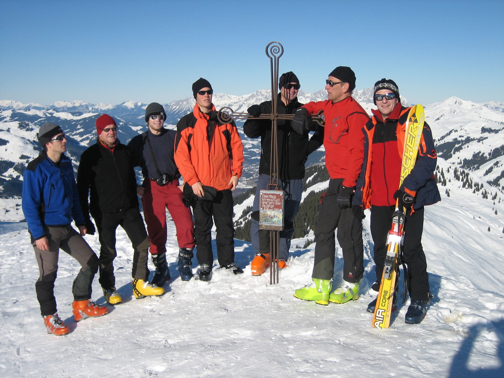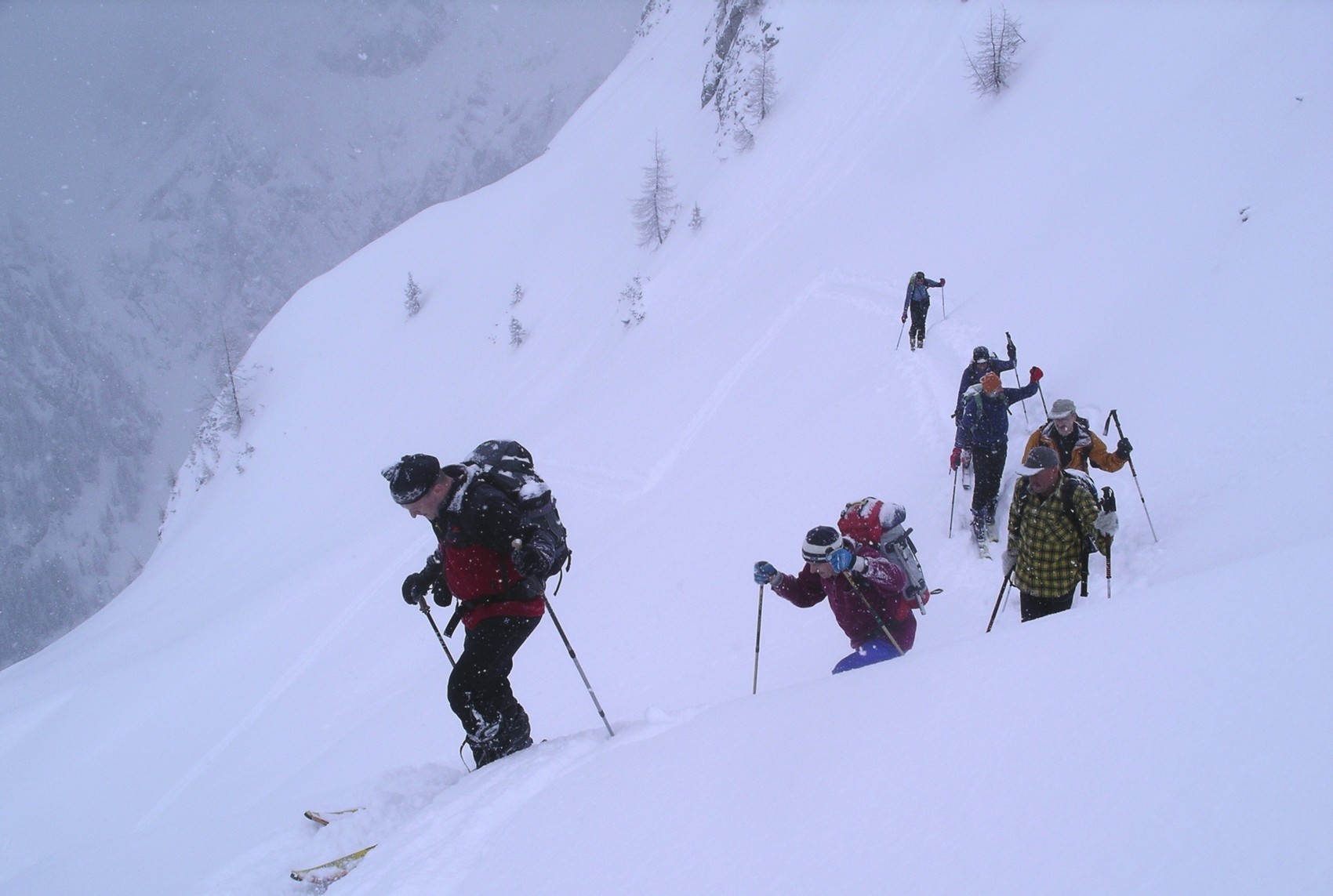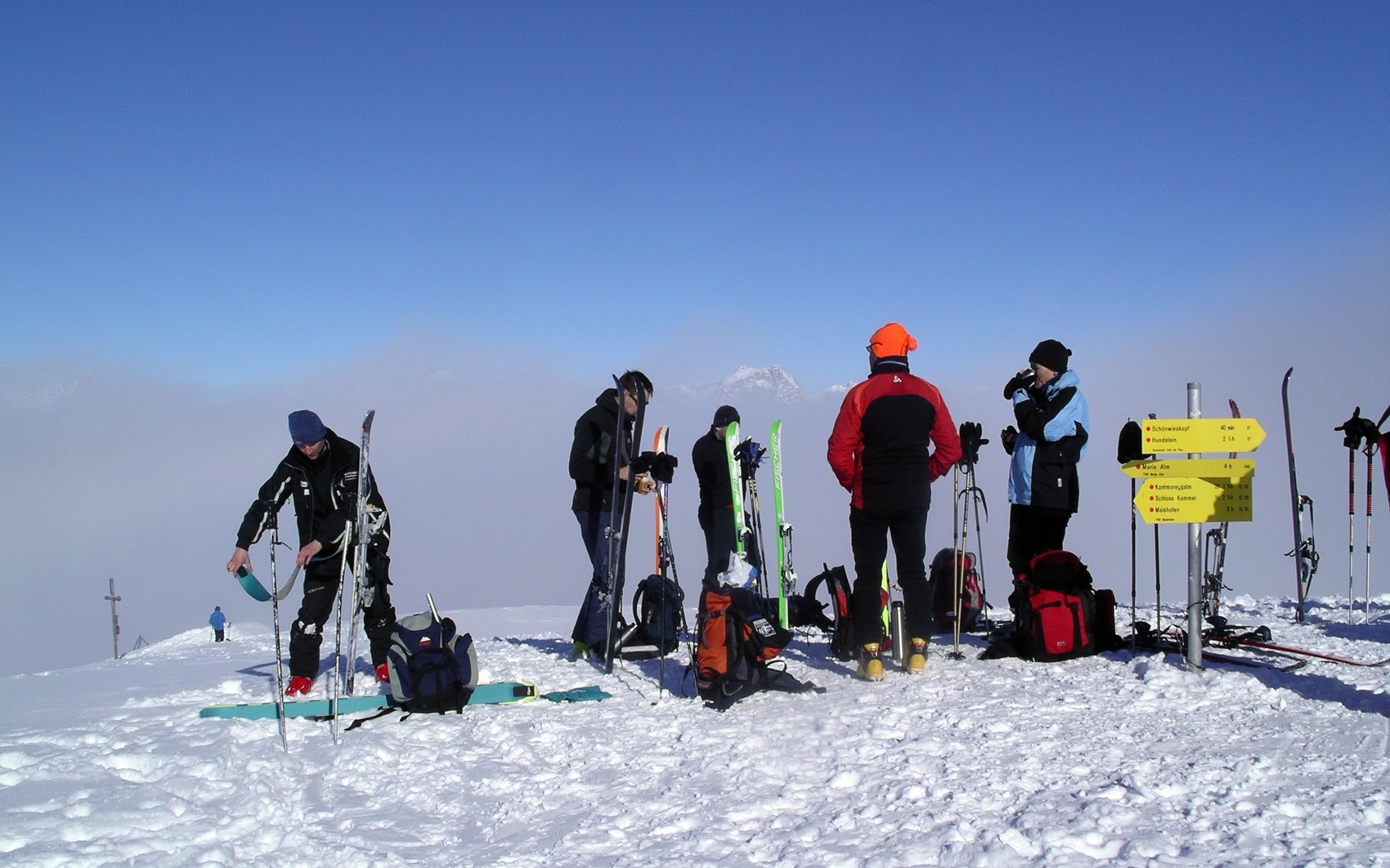 Die Schneelage in den Berchtesgadenern war etwas dürftig – zumindest glaubten wir das –, daher verlegten wir das Ziel zur Schwalbenwand in den Dientener Bergen. Zu Neunt starteten wir von Maria Alm aus über die Unterbergroute, die von Norden größtenteils über Almwiesen zum Gipfel führt. Bei schönstem Wetter erreichten wir den Gipfel. Der war grad so hoch, dass die Größten von uns den Kopf noch über die Wolken strecken konnten. Das schöne Wetter blieb leider am Gipfel, so fuhren wir in derselben Nebelsuppe, in der wir aufgestiegen sind, wieder ab. Schöne teilweise auch unverspurte Tiefschneehänge fanden wir trotzdem, eine kleine Klettereinlage eher deshalb. Ein lohnendes Ziel für uns Skitourengehen war die Schwalbenwand allemal.