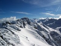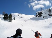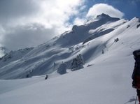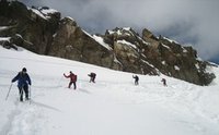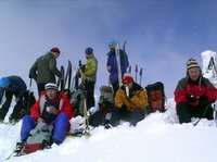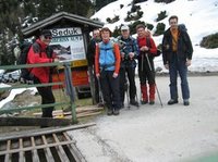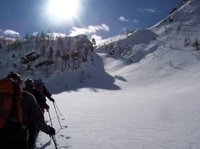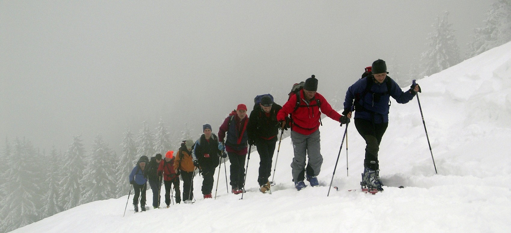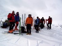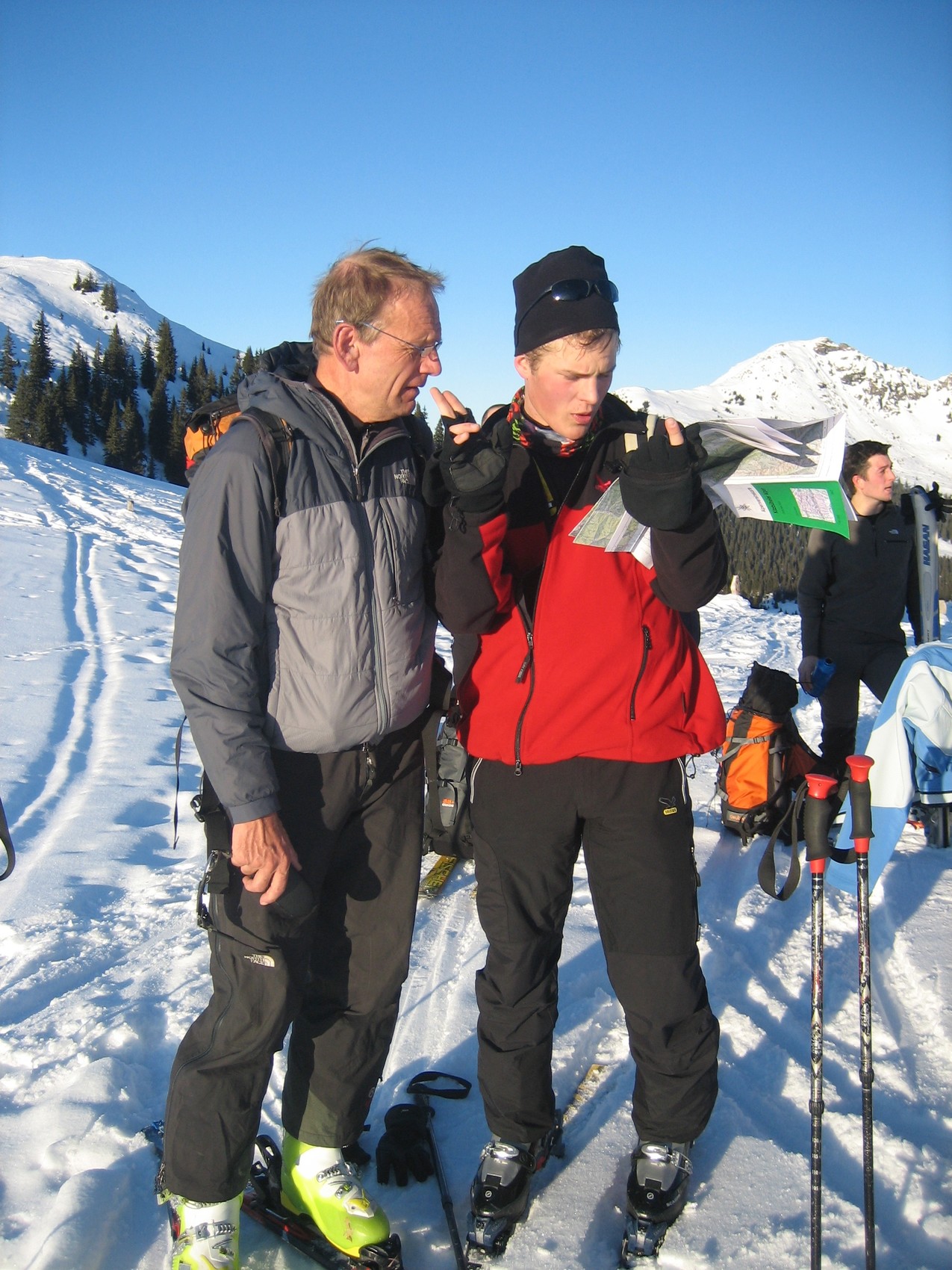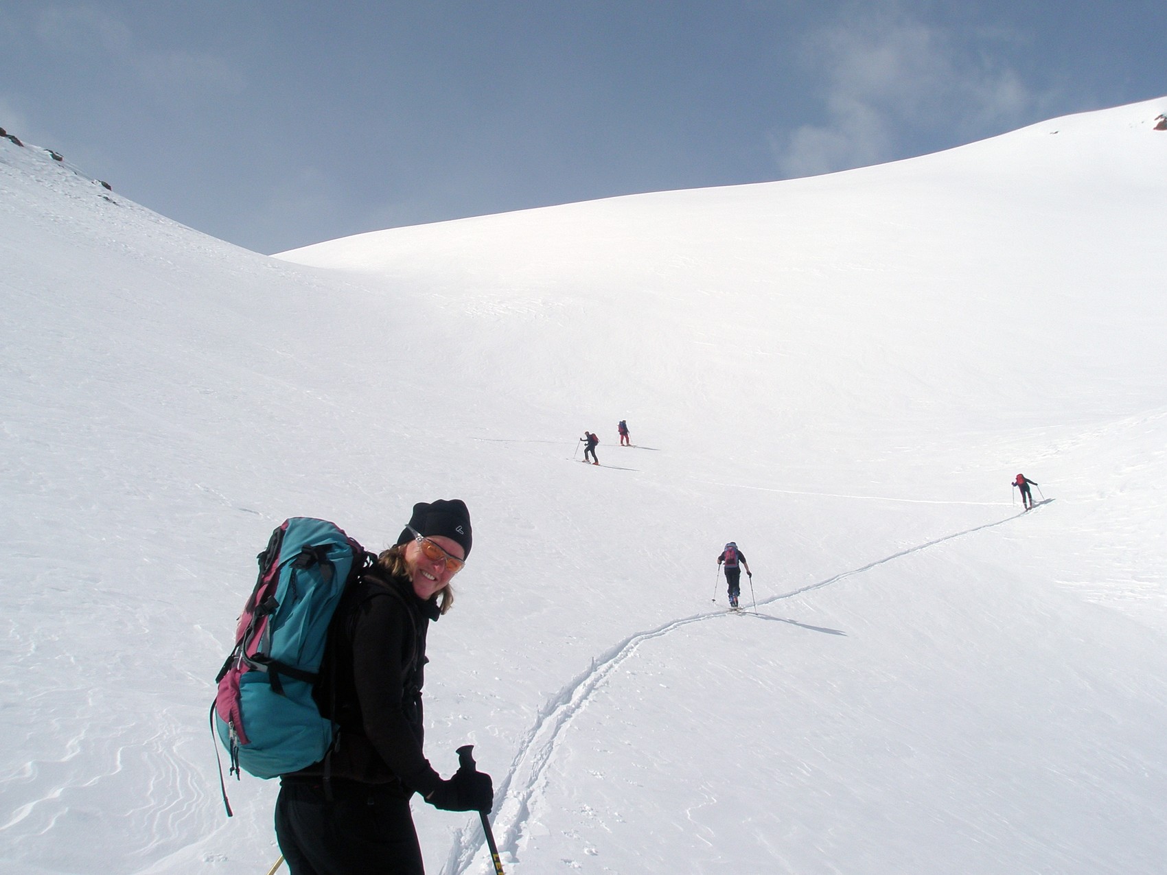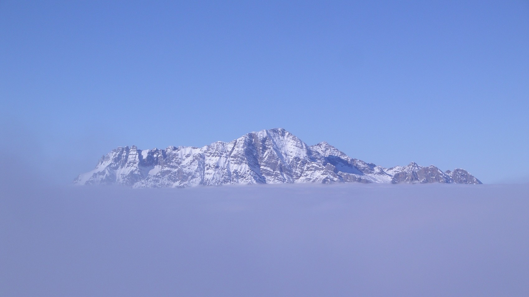 Die Schneelage in den Berchtesgadenern war etwas dürftig – zumindest glaubten wir das –, daher verlegten wir das Ziel zur Schwalbenwand in den Dientener Bergen. Zu Neunt starteten wir von Maria Alm aus über die Unterbergroute, die von Norden größtenteils über Almwiesen zum Gipfel führt. Bei schönstem Wetter erreichten wir den Gipfel. Der war grad so hoch, dass die Größten von uns den Kopf noch über die Wolken strecken konnten. Das schöne Wetter blieb leider am Gipfel, so fuhren wir in derselben Nebelsuppe, in der wir aufgestiegen sind, wieder ab. Schöne teilweise auch unverspurte Tiefschneehänge fanden wir trotzdem, eine kleine Klettereinlage eher deshalb. Ein lohnendes Ziel für uns Skitourengehen war die Schwalbenwand allemal.