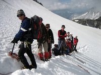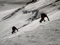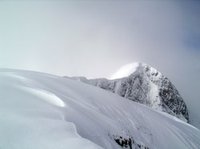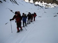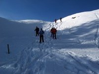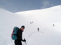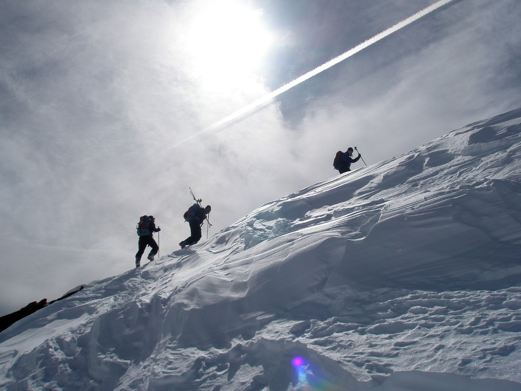 Aufgrund der Lawinengefahrenstufe 3 mussten wir unter optimaler Geländeausnutung einen möglichst sicheren Anstieg zum Gipfel auswählen. Dank sehr guten Kartenmaterials konnte bereits im Vorfeld eine genaue Anstiegsplanung erfolgen. Doch was hilft die beste Planung bei schlechten Sichtverhältnissen in diesem in Bezug auf Steilheit stark wechselndem Gelände?