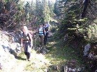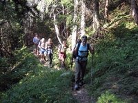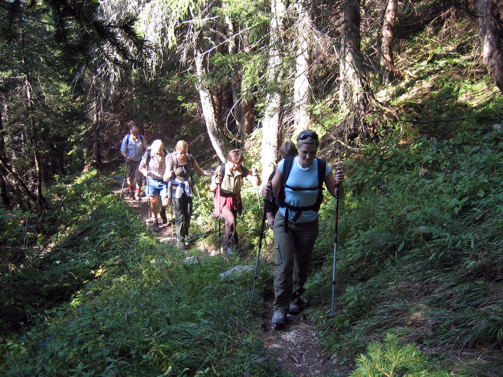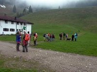 Da bei diesem Wochenende das Feiern im Vordergrund stand, konnten sogar die schlechten Wetteraussichten die Freude nicht trüben. In unterschiedlichen Gruppen, ob von ganz unten oder von der Ruine, wurde zum Hüttensturm angesetzt. Gut dass nicht viele andere Wanderer unterwegs waren, hätten sie sich doch über die mitgeführten Instrumente sehr gewundert. Schließlich darf nicht alle Tage ein Kontrabass sein Hüttendebüt geben. Hier zeigt sich die wahre Liebe eines Musikers. Viele der 43 Teilnehmer wussten das Wetterfenster zu nutzen und erreichten trocken die Bochumer Hütte. Einige, denen der Hüttenanstieg zu kurz war, bezahlten die Gipfelgier entsprechend mit total durchnässter Kleidung. Doch bei den Klängen der Musik war diese ausgiebige Dusche schnell vergessen. Überaus fleißig wurde von den sechs Musikern zum Tanzen, Mitsingen und Schunkeln aufgespielt. Selbstverständlich wurden alle Musikwünsche erfüllt. Bis spät in die Nacht hinein waren die Lieder zu hören und wie selbstverständlich wurden die Instrumente untereinander getauscht. Die Bochumer Hütte erwies sich als Glückstreffer und Gabi und Andi, die Hüttenwirte, verwöhnten uns mit sehr guten drei Gängen Menü. Nach kurzer Nacht und ein paar Liedern erreichten wir wieder, und dieses Mal alle trocken, den jeweiligen Ausgangspunkt. An dieser Stelle einen herzlichen Dank an unsere Musiker Hans Ganghofer (Kontrabass), Franz Schustereder (Akkordeon), Alois Schuster (Trompete), Bernhard Grindinger (Gitarre), Erwin Ruhland (Bariton) und Helmut Gabriel (Deifesgeign).