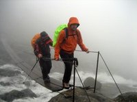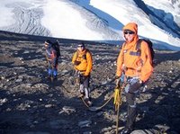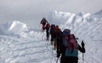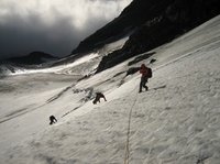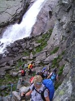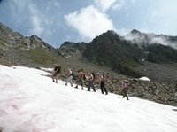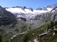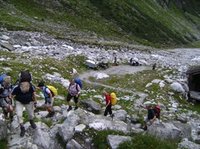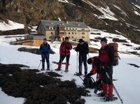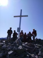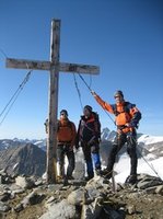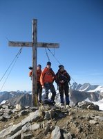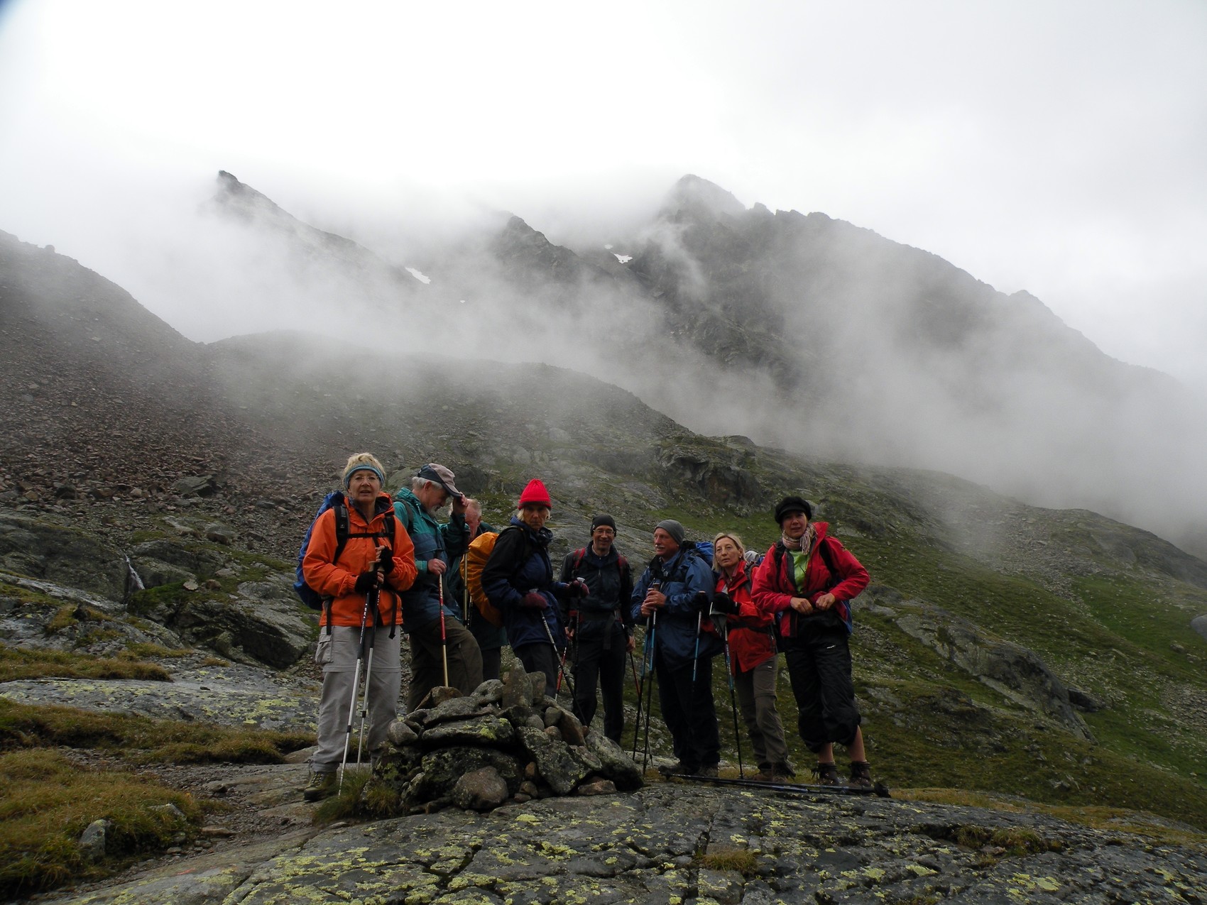 Der frühmorgendliche Aufstieg durch das Horlachtal, entlang des gleichnamigen Baches zur Schweinfurter Hütte, bei herrlichem Sonnenschein, sollte sich noch als richtig erweisen. Einen kräftigen Gewitterschauer verbrachten wir trocken und bei einer Brotzeit in der Hütte. Die Sonne kam wieder und der Gipfel des Hohen Wasserfalls (3.003 m) konnte noch bestiegen werden. Über Moränenfelder, blockigen, roten Granitfelsen einer Trümmerhalde und einer Steilrinne mit leichter Kletterei erreichten wir das Tourenziel. Eine dicke Gewitterwolke drängte zum Abstieg, aber es half nichts... dicke Graupelschauer und Regengüsse waren beim geselligen Hüttenabend schnell vergessen. Eine labile Wetterlage am nächsten Tag ließ uns kurz überlegen. Der Hüttenwirt meinte jedoch, dass sich der Zwieselbacher Rosskogel (3.081 m) ausgehen könnte und so starteten wir. Ein Wolkenmix auf dem Steiglein, aber schon Sonnenschein beim Weg über den Rosskogelferner, stimmte die Gruppe positiv für den Tag. Aber, am Gipfel angekommen, statt verdienter Brotzeit … Schneeboasln … in Schutzkleidung flohen wir ab ins Tal in die warme Stube der Hütte. Das schmackhafte Menü der geselligen Hüttenwirtin Evi trug dazu bei, dass auch dieser Abend lustig wurde. Die hohen Gipfel zeigten sich am nächsten Tag wieder in Wolken, aber trotzdem nutzen wir den letzten Tag und wanderten entlang der Wasserfälle auf das Zwieselbachjoch (2.870 m).