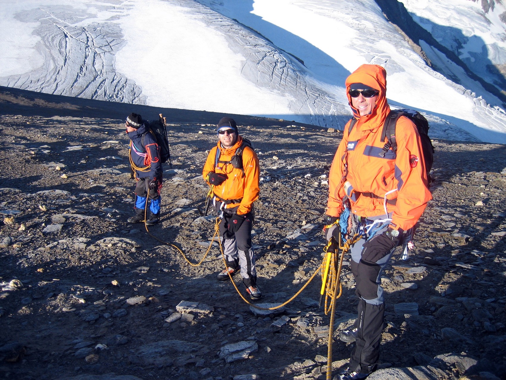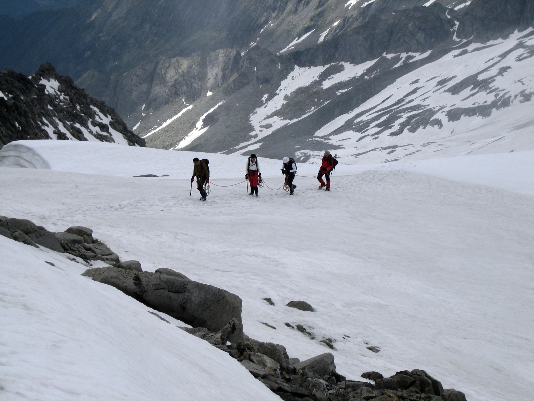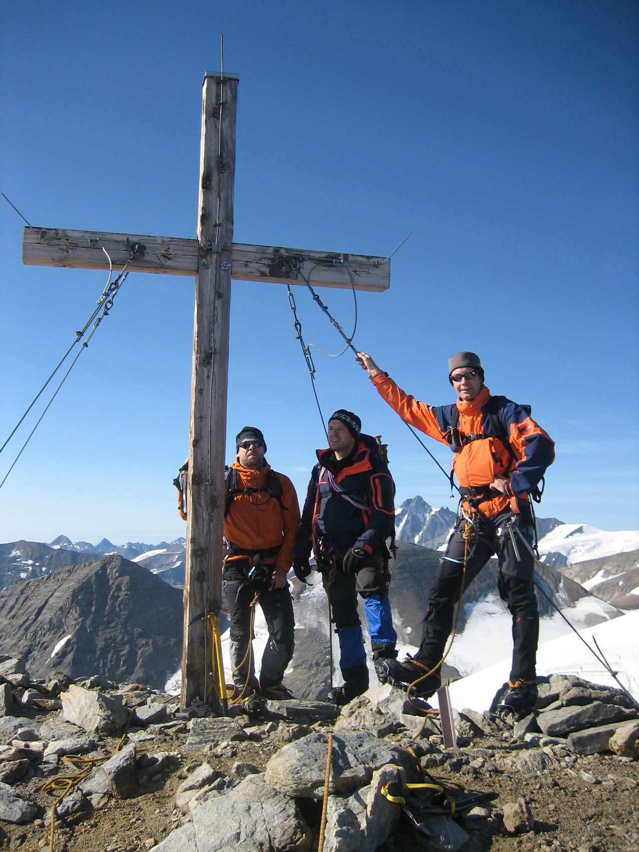 Wir setzten unser ganzes Vertrauen auf den Wetterbericht vom Wochenende. Daheim hatte es in Strömen geschüttet. Unterwegs im Auto gaben wir uns noch Mut – „was jetzt runter fällt macht uns nicht nass“. In Ferleiten unseren Ausgangspunkt, hatten wir dann trockenes Wetter. Hier stellte sich die Frage: Überhosen mitnehmen oder im Auto lassen? Aus Kollegialität ließen Franz und Marcel diese im Auto zurück – was sie bitter bereuten! Beim 3-stündigen Anstieg zur Schwarzenberghütte (2.267 m) hatte es zwei Stunden geregnet. Wir waren ALLE bis auf die Unterhose nass. Und als Andi und Erwin eine trockene „Hüttenhose“ aus dem Rucksack zogen, bereuten die anderen zwei wieder die Überhosen aus Kollegialität im Auto gelassen zu haben. So saßen 2 mit Hosen und 2 nur mit Unterhosen im Gastraum der Hütte. Dank der mollig warmen Küche, wurden die Klamotten schnell wieder trocken. Der nächste Tag begann für uns um 3.30 Uhr und kurz nach 4.30 Uhr gingen wir in die wolkenverhangene, dunkle, nasse Nacht. Am Hochgruberkees gesellte sich das Licht des Tages zu uns. Und an der Gruberscharte (3.104 m) blinzelten wir der Sonne entgegen. Nach Inspektion der orangen, raumfahrzeugähnlichen Biwakschachtel, ging es der Klocknerin (3.422 m) über den Südgrat entgegen. Nur kurz war die Pause, denn wir hatten ein volles Programm an diesem Tag. Weiter ging es bergab und bergauf, dem Hinteren Bratschenkopf (3.412 m) entgegen. Erst hier kam die Ernüchterung, unser geplantes Ziel das Große Wiesbachhorn (3.570 m) war zum greifen nahe, aber für uns unerreichbar. Der Teufelsmühlkees war soweit abgeschmolzen, dass wir einfach nicht in die Scharte zwischen den Bratschenköpfen hinunter kamen. Wir konnten es fast nicht glauben, aber ein Abklettern im Schutt und Geröll gleichte einem Himmelfahrtskommando. Wir ließen es natürlich und wählten leicht geknickt den Abstiegsweg über den Vorderen Bratschenkopf (3.401 m) und den Bratschen zur Schwarzenberghütte. Auch die immer noch feuchte Platte am unteren Ende des Hochgruberkees absolvierten wir mit Bravour. Nur beim Sprung über die Rauschenden Bäche, setzten die ersten Ermüdungserscheinungen ein. Nach kurzer Hüttenrast setzten wir unseren Abstieg ins Tal fort. Anders als am Vortag bei Regen, konnten wir uns für den Abstieg reichlich Zeit lassen und die Aussichten genießen. Leider hat es auch diesmal mit der Besteigung des Gr. Wiesbachhorns nicht geklappt.