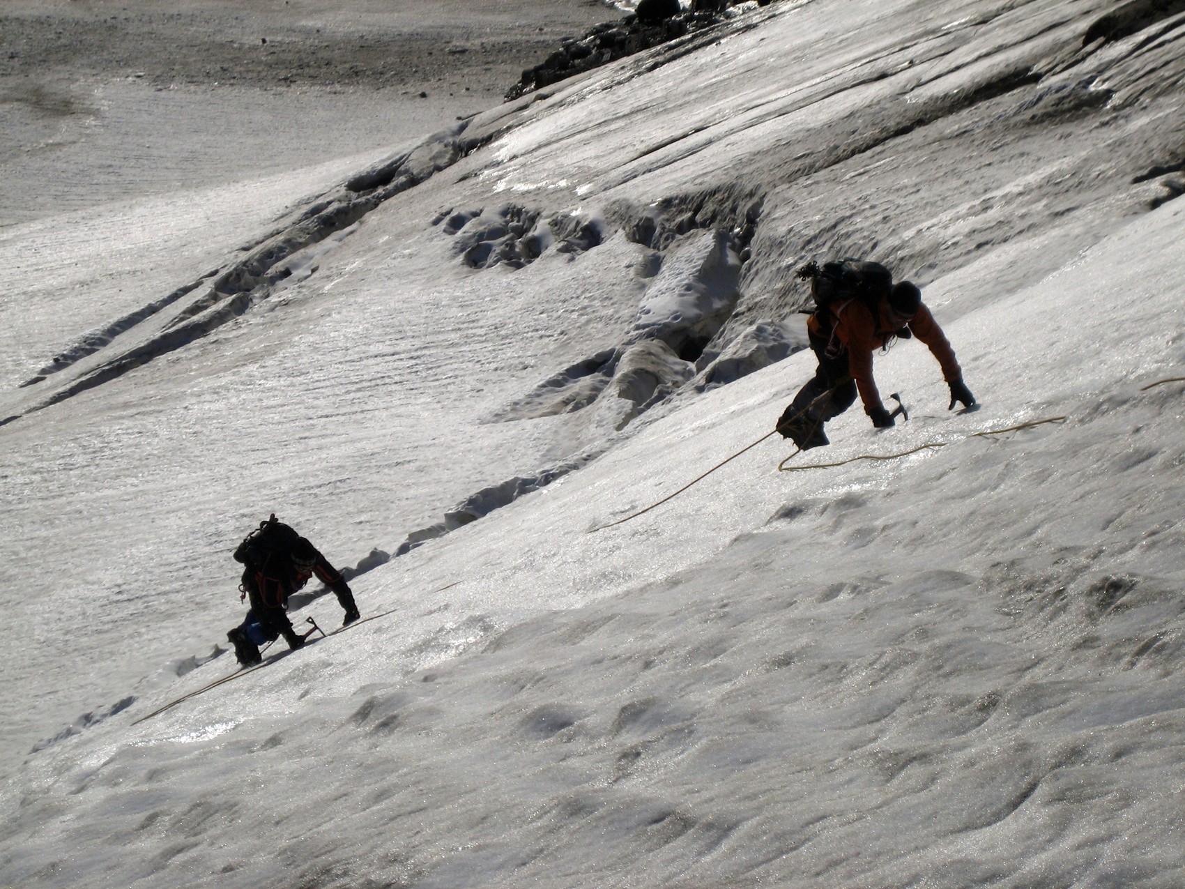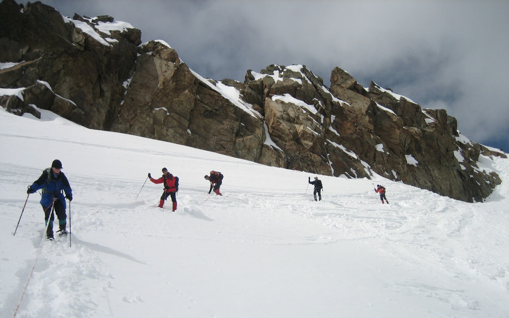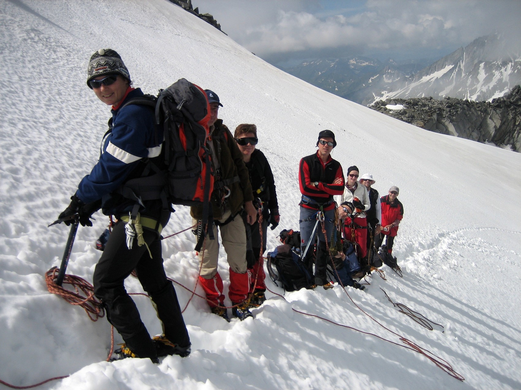 Wir setzten unser ganzes Vertrauen auf den Wetterbericht vom Wochenende. Daheim hatte es in Strömen geschüttet. Unterwegs im Auto gaben wir uns noch Mut – „was jetzt runter fällt macht uns nicht nass“. In Ferleiten unseren Ausgangspunkt, hatten wir dann trockenes Wetter. Hier stellte sich die Frage: Überhosen mitnehmen oder im Auto lassen? Aus Kollegialität ließen Franz und Marcel diese im Auto zurück – was sie bitter bereuten! Beim 3-stündigen Anstieg zur Schwarzenberghütte (2.267 m) hatte es zwei Stunden geregnet. Wir waren ALLE bis auf die Unterhose nass. Und als Andi und Erwin eine trockene „Hüttenhose“ aus dem Rucksack zogen, bereuten die anderen zwei wieder die Überhosen aus Kollegialität im Auto gelassen zu haben. So saßen 2 mit Hosen und 2 nur mit Unterhosen im Gastraum der Hütte. Dank der mollig warmen Küche, wurden die Klamotten schnell wieder trocken. Der nächste Tag begann für uns um 3.30 Uhr und kurz nach 4.30 Uhr gingen wir in die wolkenverhangene, dunkle, nasse Nacht. Am Hochgruberkees gesellte sich das Licht des Tages zu uns. Und an der Gruberscharte (3.104 m) blinzelten wir der Sonne entgegen. Nach Inspektion der orangen, raumfahrzeugähnlichen Biwakschachtel, ging es der Klocknerin (3.422 m) über den Südgrat entgegen. Nur kurz war die Pause, denn wir hatten ein volles Programm an diesem Tag. Weiter ging es bergab und bergauf, dem Hinteren Bratschenkopf (3.412 m) entgegen. Erst hier kam die Ernüchterung, unser geplantes Ziel das Große Wiesbachhorn (3.570 m) war zum greifen nahe, aber für uns unerreichbar. Der Teufelsmühlkees war soweit abgeschmolzen, dass wir einfach nicht in die Scharte zwischen den Bratschenköpfen hinunter kamen. Wir konnten es fast nicht glauben, aber ein Abklettern im Schutt und Geröll gleichte einem Himmelfahrtskommando. Wir ließen es natürlich und wählten leicht geknickt den Abstiegsweg über den Vorderen Bratschenkopf (3.401 m) und den Bratschen zur Schwarzenberghütte. Auch die immer noch feuchte Platte am unteren Ende des Hochgruberkees absolvierten wir mit Bravour. Nur beim Sprung über die Rauschenden Bäche, setzten die ersten Ermüdungserscheinungen ein. Nach kurzer Hüttenrast setzten wir unseren Abstieg ins Tal fort. Anders als am Vortag bei Regen, konnten wir uns für den Abstieg reichlich Zeit lassen und die Aussichten genießen. Leider hat es auch diesmal mit der Besteigung des Gr. Wiesbachhorns nicht geklappt.