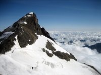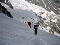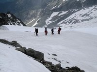 Früh ins Bett, und trotzdem wenig geschlafen, ging es am nächsten Morgen um 5.45 Uhr los in Richtung Gletscher. Um eine so große Gruppe sicher zum Gipfel führen zu können, waren drei Seilschaften erforderlich. Mit Monika Durner wurde die dritte Seilschaftsspitze besetzt. Der Übergang von Fels zum Eis des Floitenkees, welcher mit einer dicken Schneedecke bedeckt war, erfolgte bei einer Höhe von ca. 2.600 m. Von hier an ging es angeseilt, im mäßig steilen Gelände dem Tribbachsattel (3.179 m) entgegen. Die warmen Temperaturen weichten den schneebedeckten Gletscher stetig auf, so dass der Aufstieg immer mühsamer wurde. Zwei Steilstufen kurz unterhalb des Gipfels waren für uns eine Herausforderung. Bei herrlichem Bergwetter standen wir am Gipfel des Großen Löfflers. Besonders groß war die Freude bei den Hochtourenneulingen Inge Ruhland, Marga Geier, Maria Fischer und Karl Würger über ihre erbrachte Leistung. Die Aussicht, die sich uns bot, war kaum mit Worten zu beschreiben. Der Blick ging über die gesamten Zillertaler Alpen hinweg und 1150 Höhenmeter weiter unten, winzig klein, die Greizer Hütte. Um 11.30 Uhr begann der Abstieg. Nach dem flachen Gipfelrücken erreichten wir den Steilhang, welcher mit Frontalzacken-Technik vorsichtig abgeklettert wurde. Anders als im Aufstieg wurde der Abstieg in direkter Falllinie absolviert. Am Gletscherrand angekommen, wurden die Seile, Gamaschen und Klettergurte in die Rucksäcke gepackt.