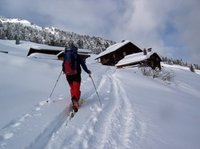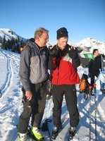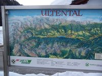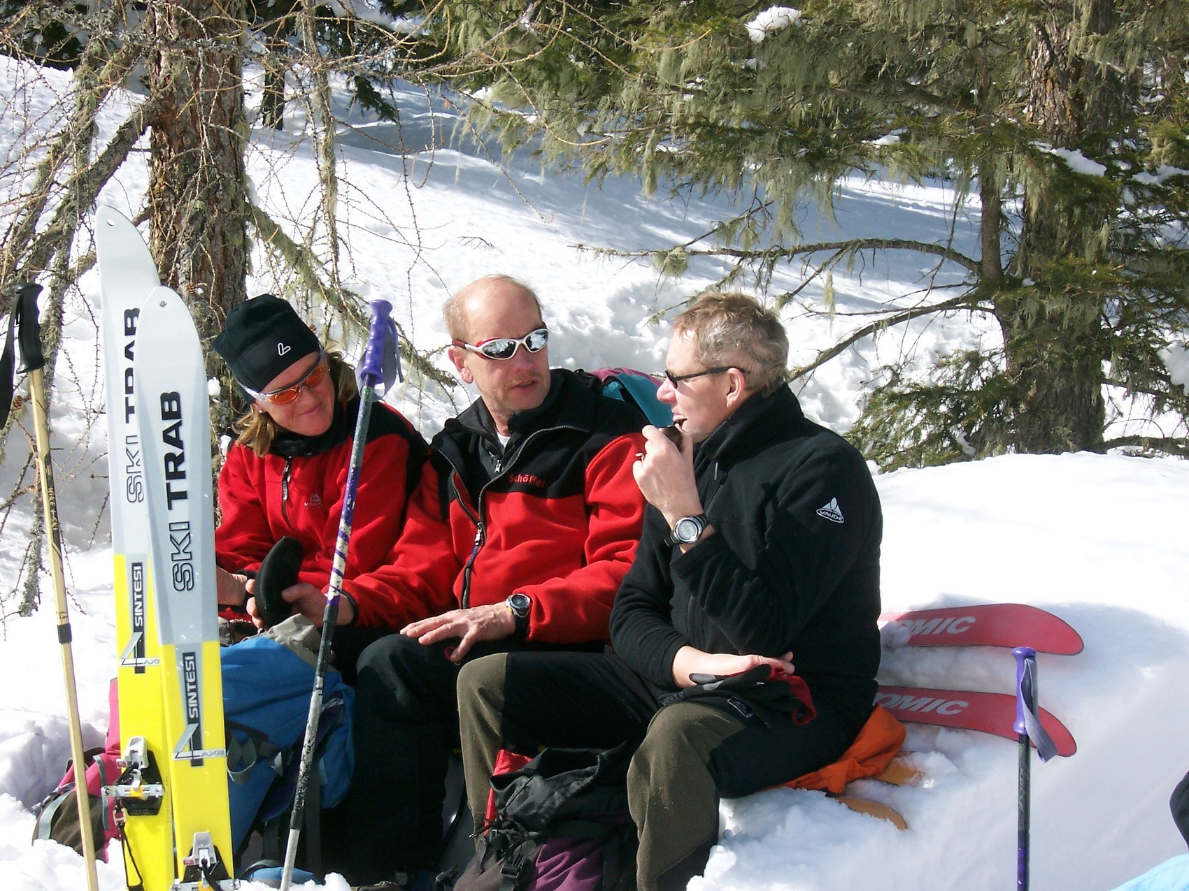 Meine innere Alarmglocke beginnt zu schrillen. Kann ich es verantworten, mit einer mir anvertrauten Gruppe in dieses Gebiet zu fahren? Was bleiben uns für Alternativen? Auch die Nordalpen versinken im Schnee und die Wetterprognose im Norden sieht mehr als bescheiden aus. Die letzen 48 Stunden vor der Abreise verbringe ich ca. 2 Stunden an Telefon und Internet um die aktuellsten Infos über Wetter- und Schneebedingungen im gesamten Ostalpenraum einzuholen. Am Donnerstag hört es endlich zu schneien auf und es setzt sich im Süden Hochdruckeinfluss durch, der Schnee beginnt sich langsam zu setzen und ich hoffe auf eine schnelle Entspannung dieser extremen Situation. Nach eingehendem Kartenstudium aber war bald klar, daß die geplanten Hochtouren auf die ca. 3.500 m hohen Gipfeln aufgrund der Lawinengefahr wahrscheinlich ad acta gelegt werden mussten und wir uns mit Gipfeln eine Stufe niedriger begnügen mussten. Doch wie sich später herausstellen sollte, waren diese Entscheidungen goldrichtig und alle Tourenteilnehmer kamen auf Ihre Kosten. So reisten wir in aller Gemütlichkeit am Samstag zu unserem Stützpunkt, einem Wirtshaus in St. Gertrud, im letzen Dorf im Tal an. Direkt von unserer Unterkunft weg gingen wir dann ausgeruht am nächsten Tag unsere Eingehtour, den Walscher Berg (Cima Trenta, 2.636 m) über das romantische Kirchbergtal an. Es ist bis zum Gipfel gespurt und wir wählen den Anstieg über den Nordgrat. Nach einer schönen Pulverschneeabfahrt im tiefen Schnee, genießen strahlende Gesichter bei Rotwein und Capuccino die warme südtiroler Nachmittagssonne auf der Hausbank vor unserer Unterkunft.