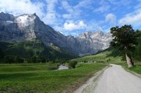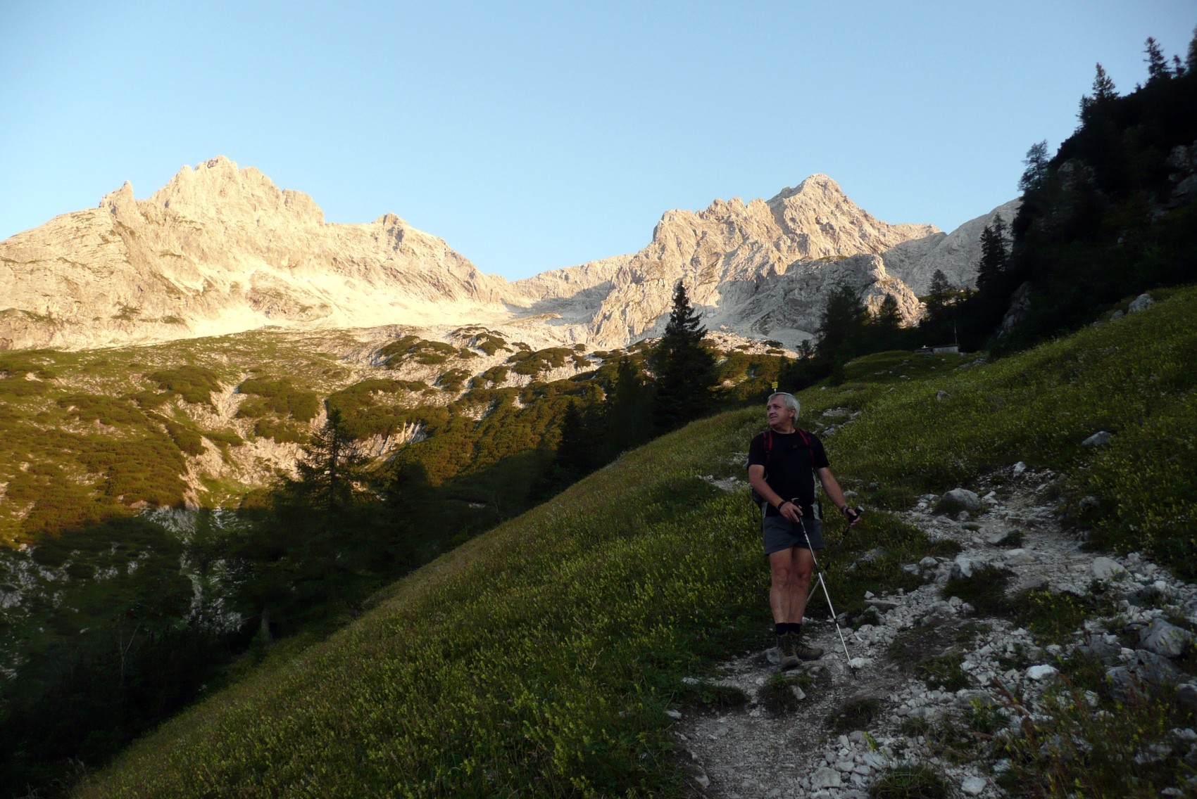 Im Süden, in Bärnstatt lag unser Ausgangspunkt. Das bedeutete aber auch, dass wir den Scheffauer Kaiser zuerst umrunden mussten. Als wir die Walleralm erreichten, war es für einen Frühschoppen noch zu früh und so ging es über das Hochegg in Richtung Kaindlhütte weiter. Diese lag leider nicht direkt auf unserem Weg. Weiter ging es durch lichten Wald und diversen Geländestufen zum großen Schuttkar, dem „Großen Friedhof“, zum Einstieg zum Widauersteig. Die schwierigen und exponierten Stellen waren mit Drahtseilen, Eisenklammern und Stiften gut gesichert, also ideal zum Klettersteigausprobieren. Nach Erreichen der Scharte war der Gipfel schon zum Greifen nahe. Lediglich die Kegelstatt und leichtes Felsgelände waren noch zu überwinden, bevor die Gipfelbrotzeit mit Rundumblick genossen werden konnte. Der südseitige, sehr steile Abstieg forderte noch mal volle Konzentration von uns und auch die so typischen Kaiserschuttreissen waren nicht zu unterschätzen. Die Steiner-Hochalm lud noch zum Verweilen ein und bei Harfenmusik und Gesang des Sennerpaares rückte der oft so hektische Alltag in weite Ferne.